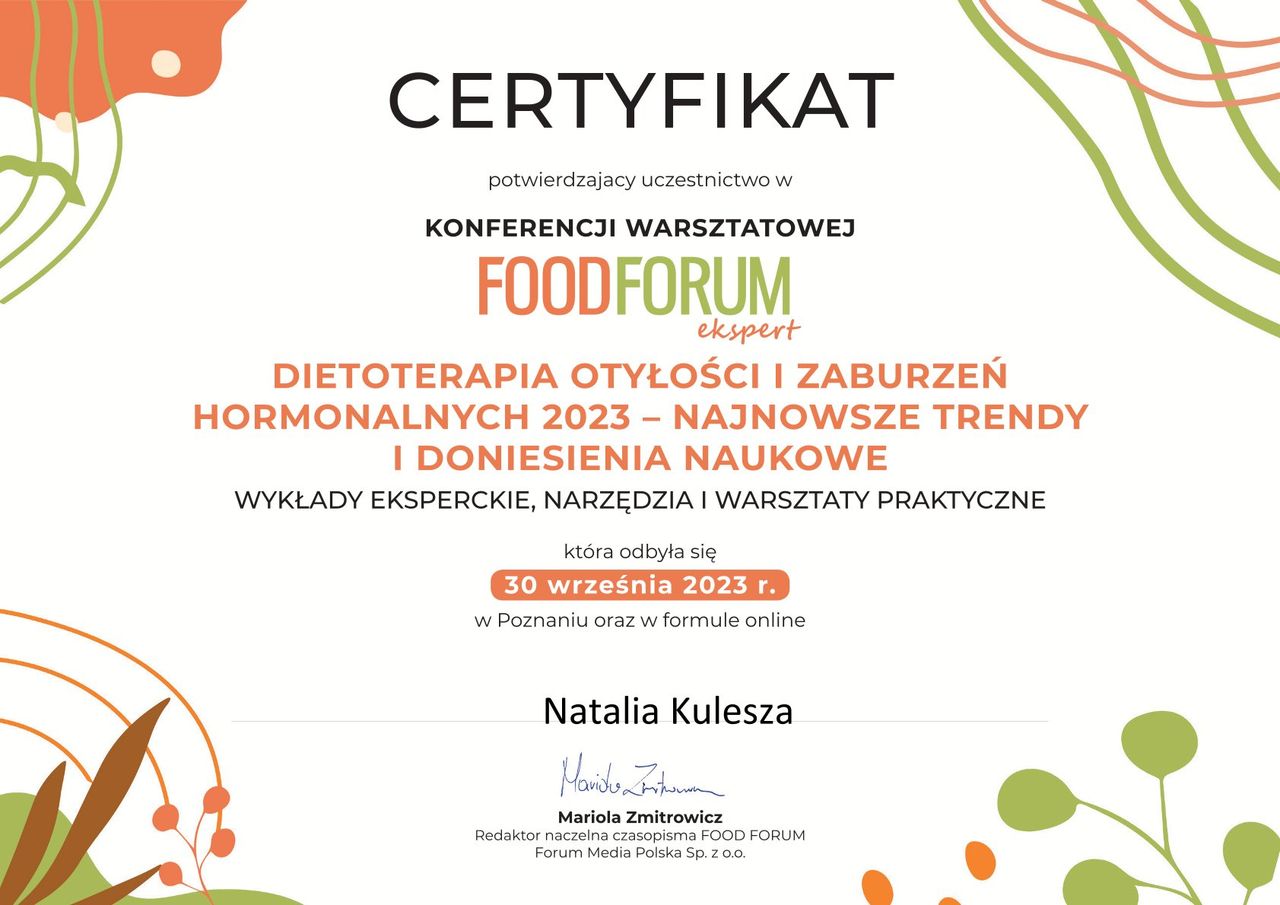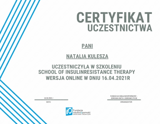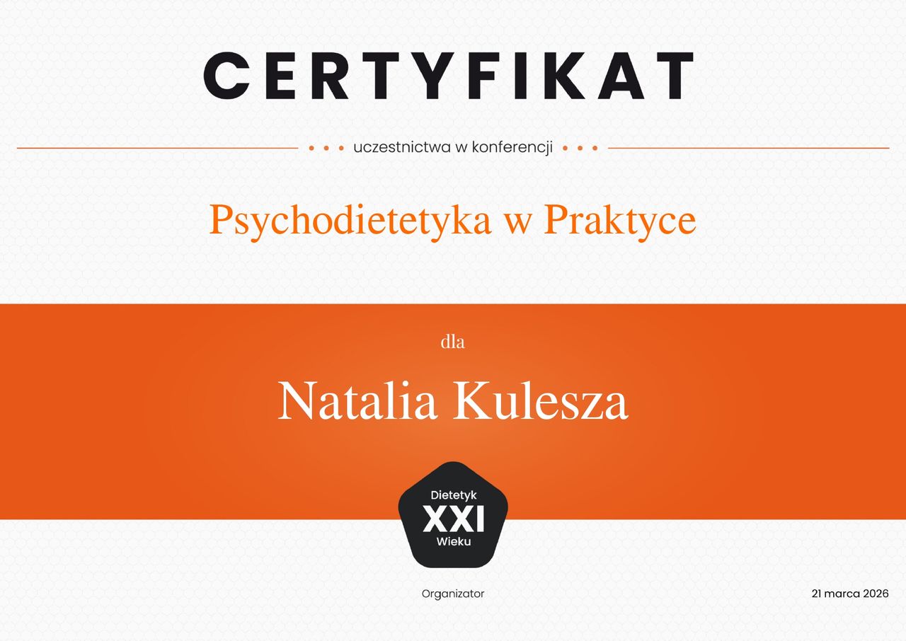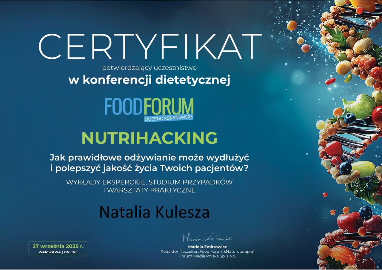 Trafiłam do pani Natalii z insulinoopornoscia i mętlikiem w głowie. Już po pierwszej konsultacji poczułam ulgę - wreszcie ktoś mi wszystko wytłumaczył. Dostałam jasne wskazówki, idealnie dopasowany jadłospis i realnie wyznaczone cele. Po 3 miesiącach wykonalysmy kontrolne badania i tu był dla mnie szok, że dieta tak zadziała! Wyniki się poprawiły, a ja czuję się zdecydowanie lepiej. Polecam z całego serce!