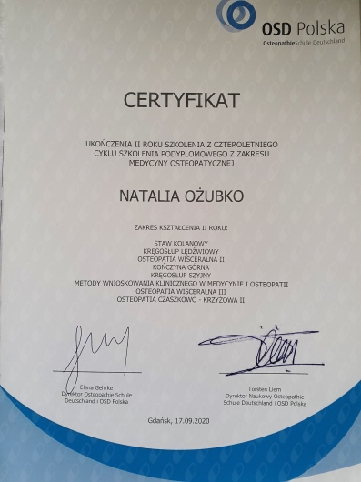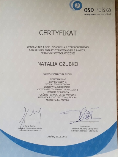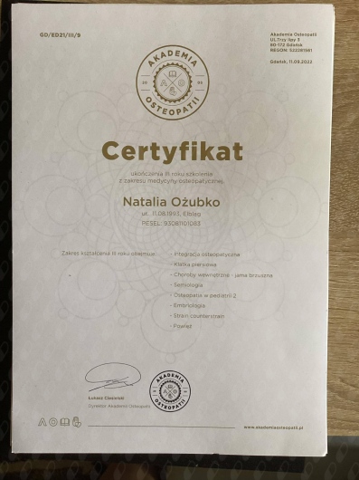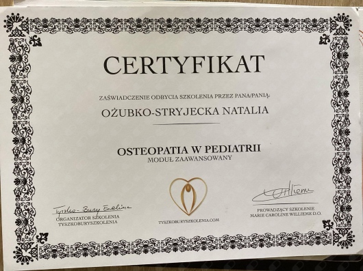 Jaki jest zakres porad oferowanych przez Natalia Ożubko–Stryjecka?Natalia Ożubko–Stryjecka to fizjoterapeuta, osteopata. Na podstawie swojego doświadczenia i wykształcenia Natalia Ożubko–Stryjecka oferuje usługi takie jak: osteopatia, osteopatia pediatryczna, osteopatia ginekologiczna.