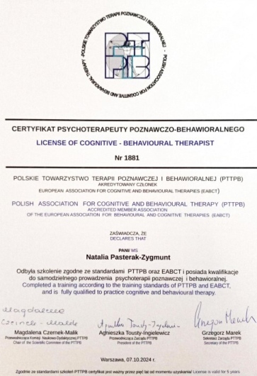 Pani Natalia jest bardzo empatycznym i profesjonalnym specjalistą. Chodziłam do Pani regularnie przez około rok, terapia okazała się skuteczna w przypadku mojego zaburzenia lękowego. Bardzo polecam Panią Natalię!