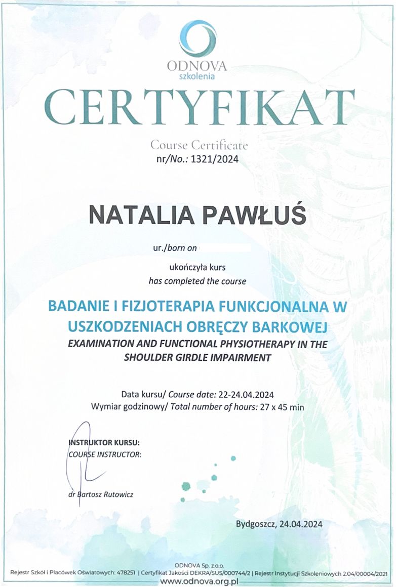 Pod skrzydła Pani Natalii trafiłam z praktycznie nie funkcjonującym prawym barkiem. Nie byłam w stanie normalnie się ubrać, rzucić piłeczki tenisowej a co dopiero realizować swoich pasji. Pani Natalia bardzo angażuje się w swoją pracę, dokładnie tłumaczy jak wykonywać ćwiczenia aby były efektywne i jest przy tym cierpliwa i kreatywna! W moim przypadku średnio mi szło z wykonywaniem ćwiczeń z kijkiem , więc Pani Natalia zaproponowała ćwiczenia z taśmą, które to wykonywałam chętnie i sumiennie. Efekt jest taki że zapomniałam o urazie, nic mnie nie ogranicza. Z całego serca dziękuję Pani Natalio , że znowu mogę normalnie żyć i robić to co kocham.