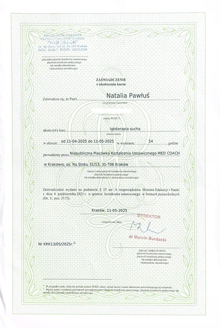 Pani Natalia pamięta historię pacjenta, słucha uważnie i zawsze zwraca uwagę na każdy szczegół. Teraz kontynuujemy terapię, żeby wzmocnić mięśnie i uniknąć nawrotów. Naprawdę polecam – pełen profesjonalizm i ogromne zaangażowanie. Rzadko spotyka się taką empatię i podejście do pacjenta!