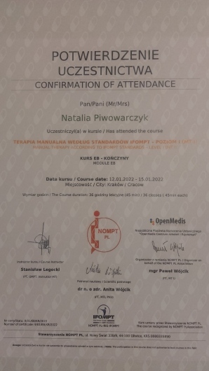 Jaki jest zakres porad oferowanych przez Natalia Piwowarczyk?Natalia Piwowarczyk to fizjoterapeuta. Na podstawie swojego doświadczenia i wykształcenia Natalia Piwowarczyk oferuje usługi takie jak: konsultacja fizjoterapeutyczna, indywidualny program treningowy, terapia wad postawy, masaż, fizjoterapia.
