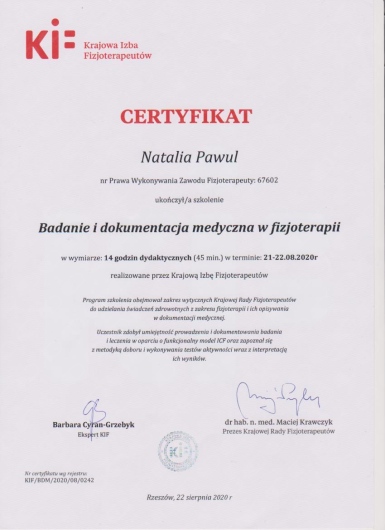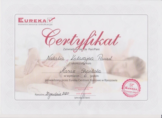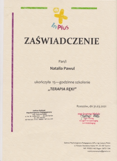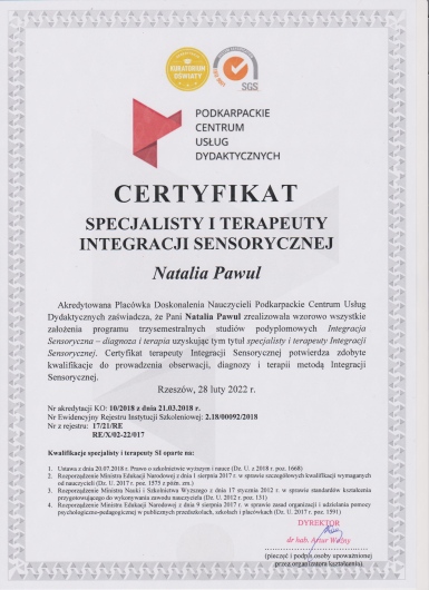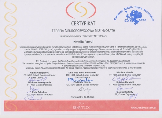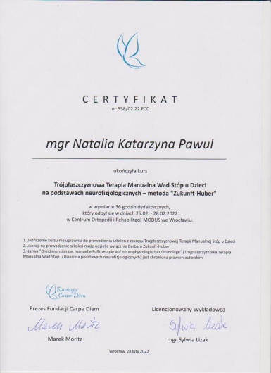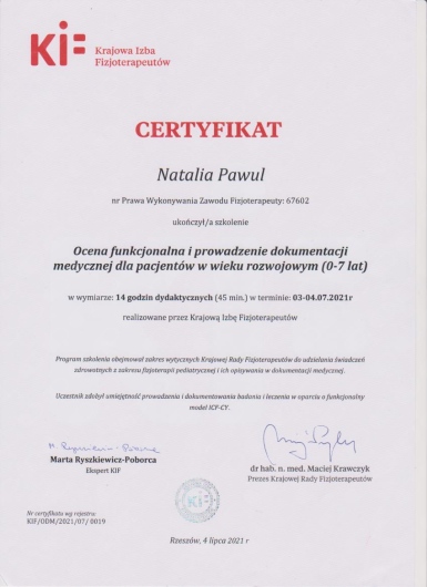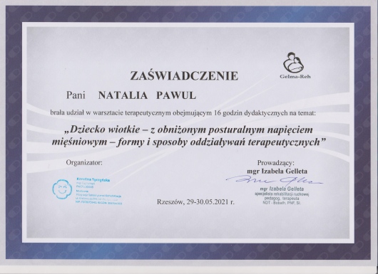 Posiadam kwalifikacje z zakresu masażu dzieci i niemowląt - Shantali, Ruchu Rozwijającego Weroniki Sherborne, ukończyłam także liczne szkolenia na temat terapii i rehabilitacji dzieci ze spectrum autyzmu. Diagnozuję wady stóp u niemowląt i dzieci starszych, prowadzę ich terapię w oparciu o metodę trójpłaszczyznowej terapii manualnej stóp wg Barbary Zukunft Huber. Ukończyłam także liczne szkolenia z zakresu zaburzeń napięcia mięśniowego niemowląt i dzieci starszych.