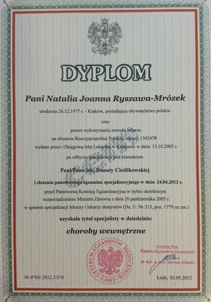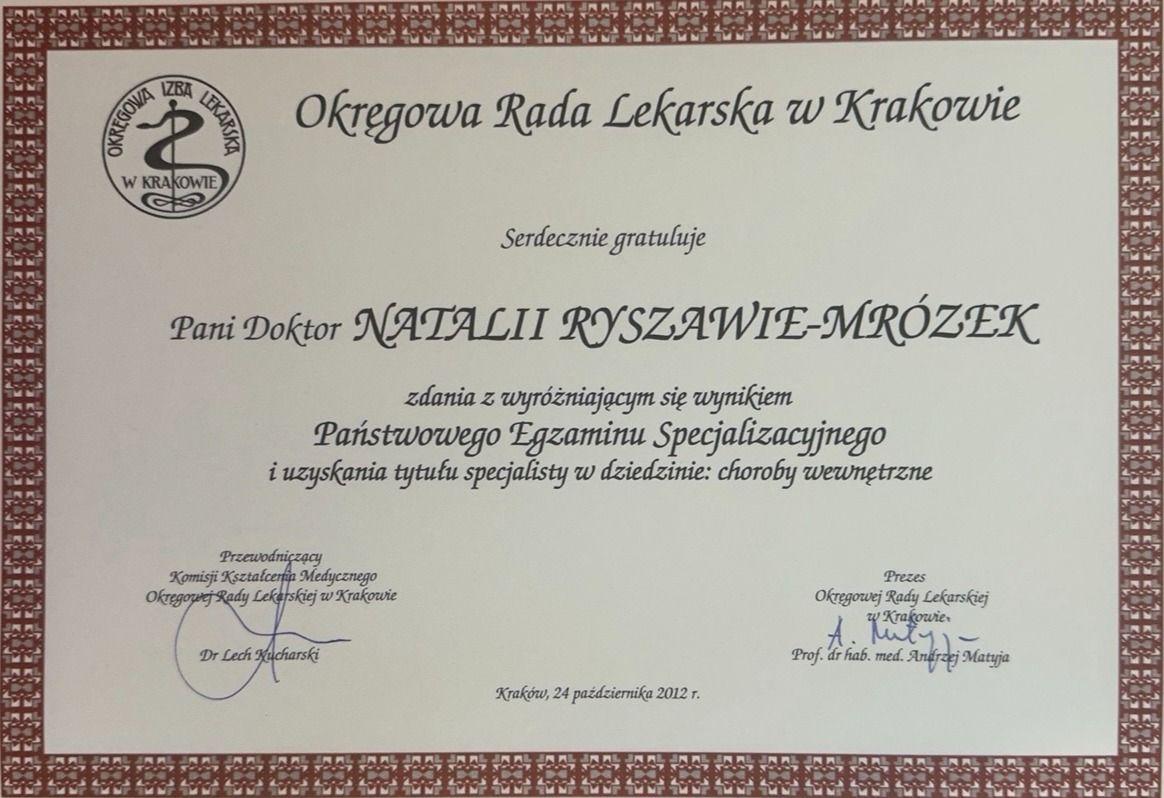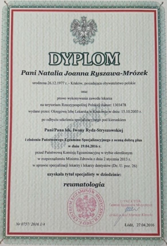 Dr n. med. Natalia Ryszawa-Mrózek - Specjalista Reumatolog, Internista. Doświadczony reumatolog i internista z Krakowa, specjalizująca się w diagnostyce i leczeniu chorób reumatycznych oraz kompleksowej diagnostyce ultrasonograficznej narządu ruchu. Specjalista reumatologii oraz chorób wewnętrznych, doktor nauk medycznych z bogatym doświadczeniem klinicznym, oferująca pełen zakres diagnostyki i leczenia chorób reumatycznych. Ekspert w dziedzinie ultrasonografii narządu ruchu oraz diagnostyki kapilaroskopowej (Posiada certyfikaty EULAR oraz Polskiego Towarzystwa Reumatologicznego).
