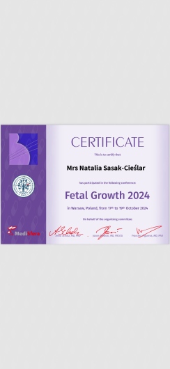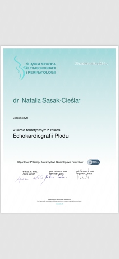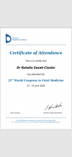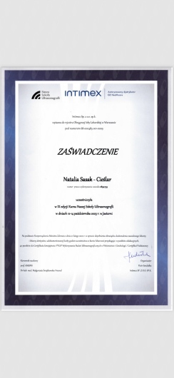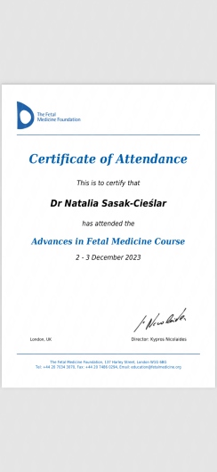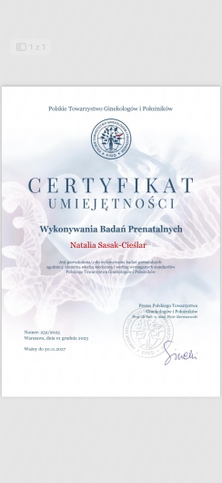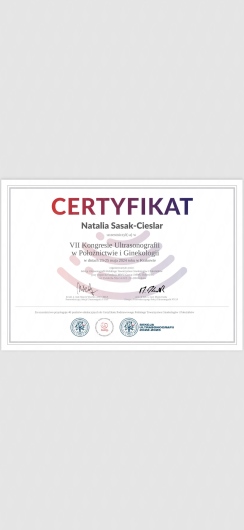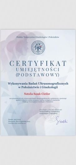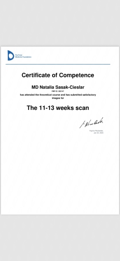 Certyfikowany ultrasonografista Polskiego Towarzystwa Ginekologów i Położników oraz posiada certyfikat Fetal Medicine Foundation z zakresu wykonywania badań prenatalnych.