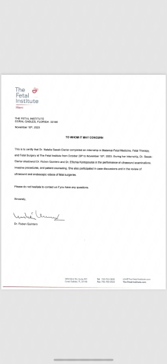 W 2023 roku odbyła staż zagraniczny w Fetal Institute w Miami w Stanach Zjednoczonych pod kierownictwem Rubena Quintero.