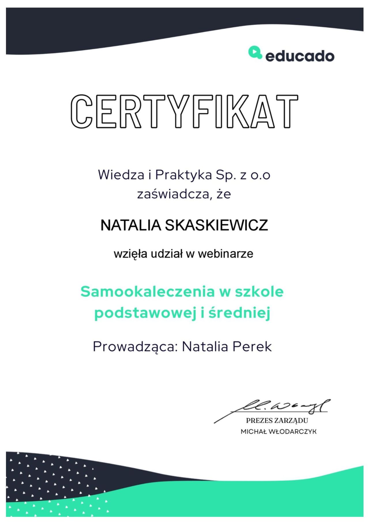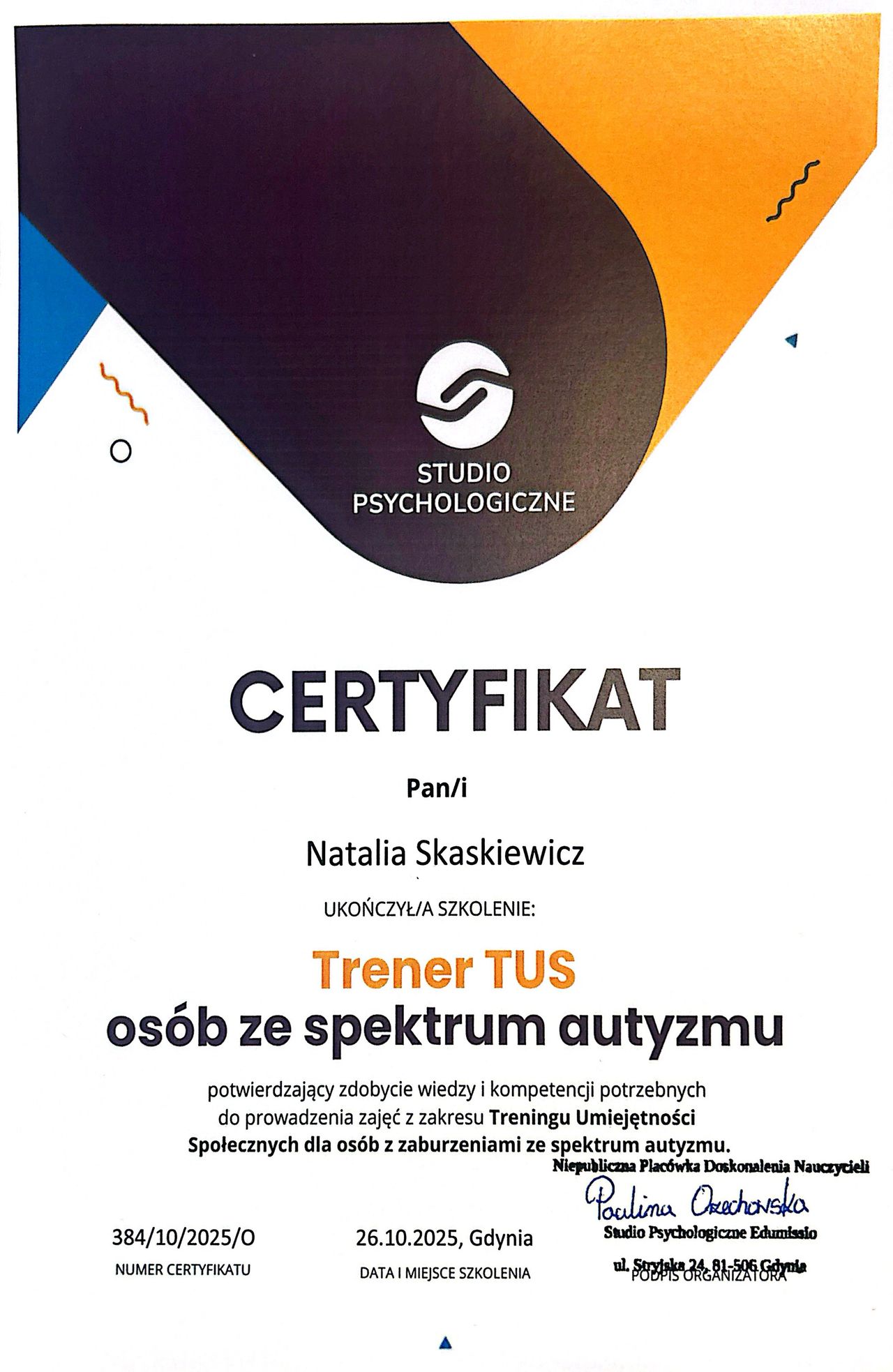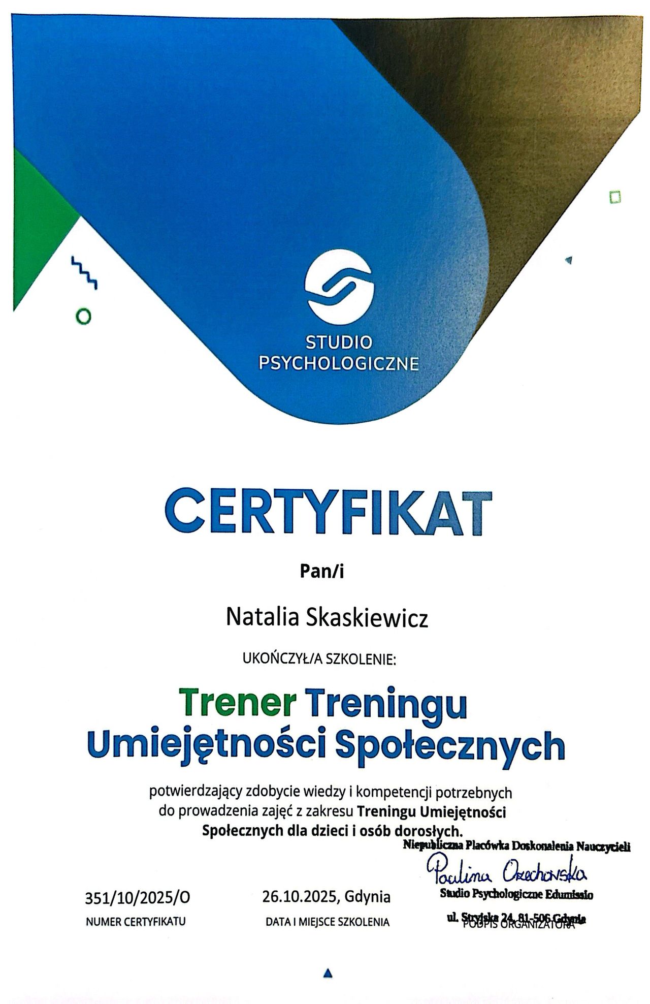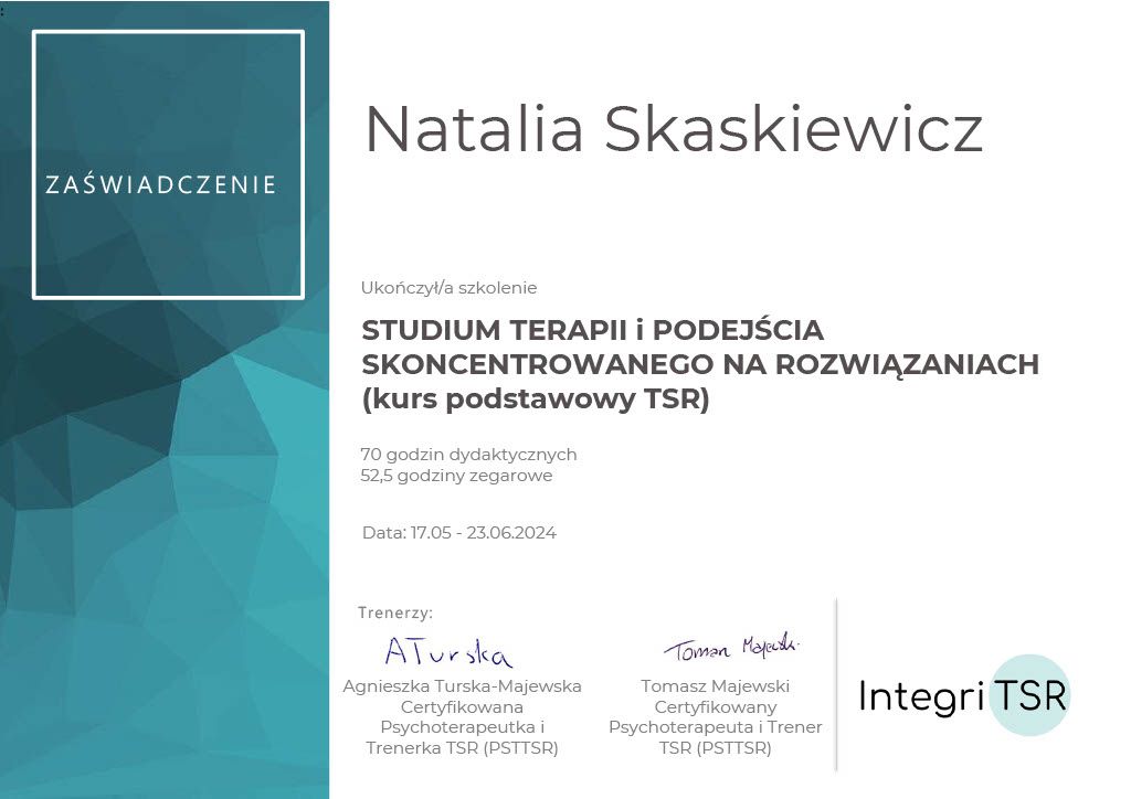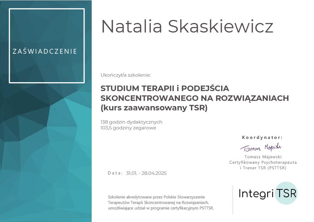 Nazywam się Natalia Skaskiewicz i jestem psychologiem o zrealizowanej specjalności psychologii klinicznej dzieci i młodzieży. Moja praca to nie tylko zawód, ale przede wszystkim pasja – wierzę, że każdy może nauczyć się radzić sobie z trudnościami, a kluczem do tego jest odpowiednie wsparcie i trening. Nieustannie się rozwijam, by jak najlepiej pomagać swoim klientom. Ukończyłam podstawowy i zaawansowany poziom terapii skoncentrowanej na rozwiązaniach (TSR) oraz pierwszy i drugi stopień Treningu Umiejętności Społecznych (TUS). Regularnie uczestniczę w szkoleniach dotyczących między innymi ADHD, samouszkodzeń wśród młodzieży oraz innych zagadnień związanych z kondycją psychiczną dzieci i dorosłych. Dodatkowo w ramach studiów pogłębiłam wiedzę z obszaru psychodietetyki oraz zaburzeń odżywiania, gdyż pracuję holistycznie i staram się zachęcać do dbania o każdy obszar, który może sprzyjać poprawie samopoczucia. Moje doświadczenie obejmuje pracę w szkole, przedszkolu, ośrodku pomocy społecznej, Ochotniczych Hufcach Pracy (OHP), a także prowadziłam warsztaty psychologiczne dla seniorów. Dzięki temu rozumiem potrzeby osób w różnym wieku i dostosowuję swoją pomoc do ich indywidualnych sytuacji. Jeśli Ty lub Twoje dziecko przeżywacie trudne chwile, zmagacie się z kryzysem, stresem, problemami emocjonalnymi czy trudnościami w relacjach – jestem tu, by pomóc. Razem możemy znaleźć najlepsze rozwiązanie i nauczyć się, jak radzić sobie z wyzwaniami życia.