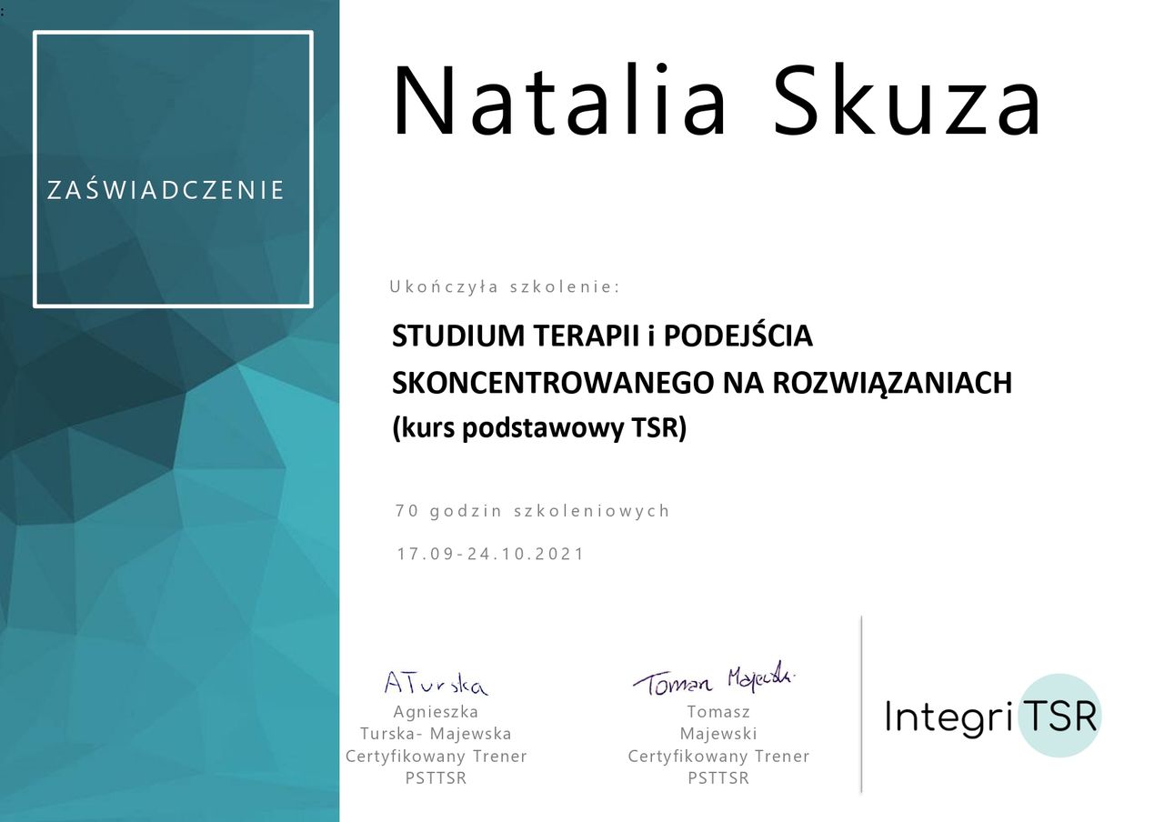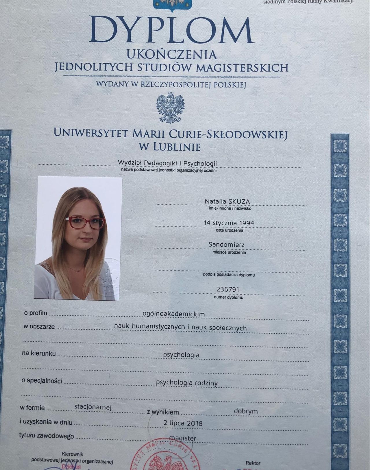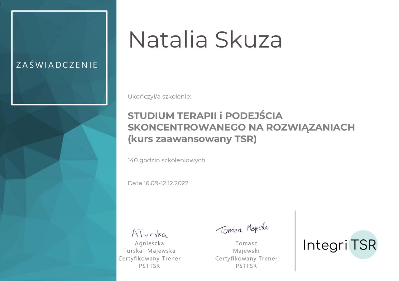 Polecam spotkania z Panią Natalią Skuza. Spotkania pozwoliły mi zobaczyć inną rzeczywistość po trudnej sytuacji w której się znalazłam i dały motywacji do działania. Dzięki terapii zrozumiałam, że mam w sobie zasoby, żeby pójść dalej. Wiem co jest moją mocną stroną.