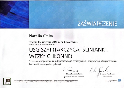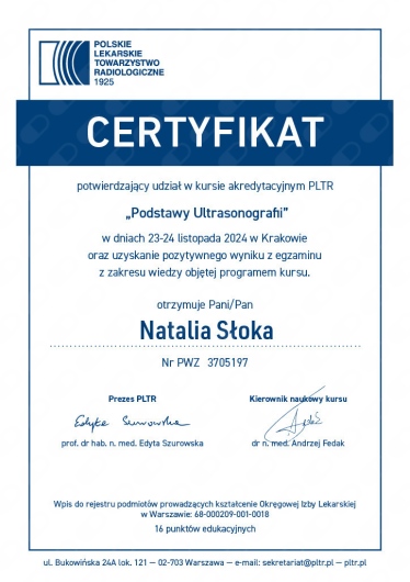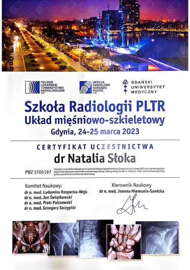 Nieustannie poszerzała swoją wiedzę i doskonali umiejętności praktyczne, uczestnicząc w szkoleniach I kursach z dziedziny Radiologii i Diagnostyki Obrazowe