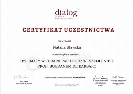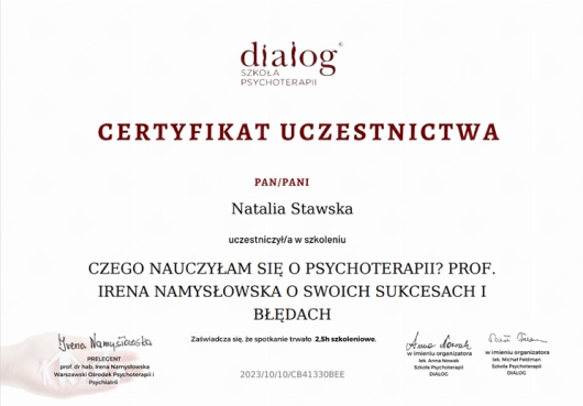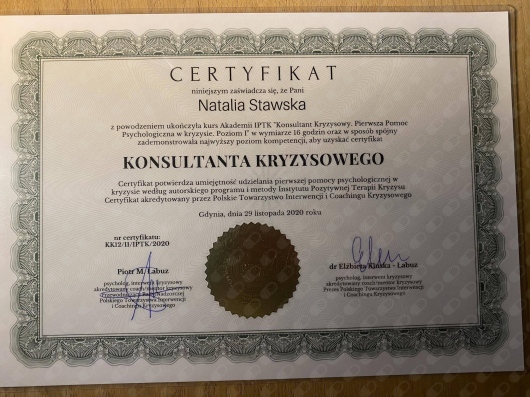 Jaki jest zakres porad oferowanych przez Natalia Stawska?Natalia Stawska to psycholog, psychoterapeuta. Na podstawie swojego doświadczenia i wykształcenia Natalia Stawska oferuje usługi takie jak: Konsultacja psychologiczna, psychoterapia indywidualna.