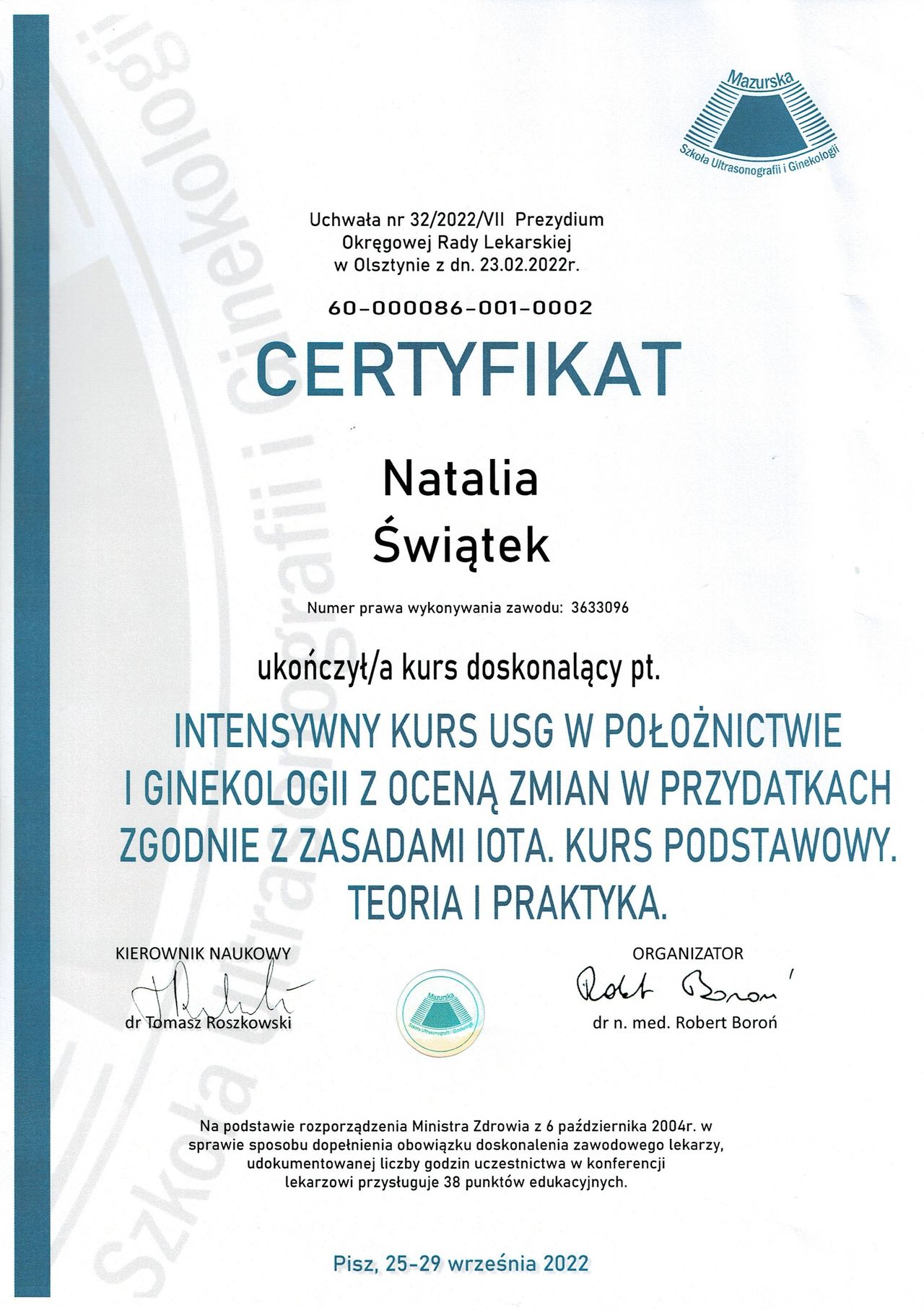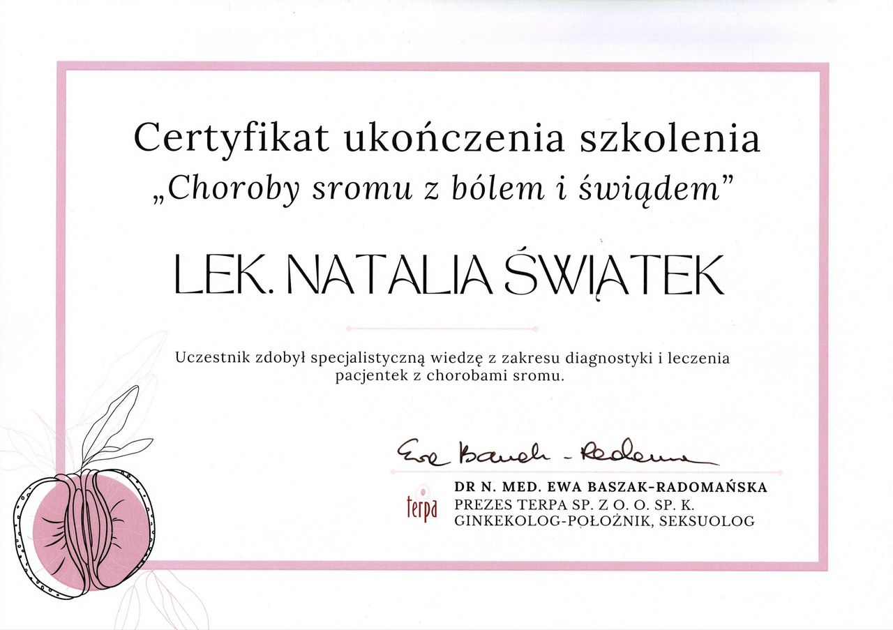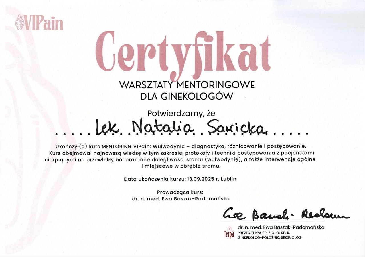 Jestem absolwentką I Wydziału Lekarskiego na Warszawskim Uniwersytecie Medycznym. Odbywam szkolenie specjalizacyjne w ośrodku klinicznym Warszawskiego Uniwersytetu Medycznego. W swojej pracy staram się całościowo patrzeć na problemy i potrzeby pacjentki. Obszarem mojego szczególnego zainteresowania są choroby związane z bólem i świądem sromu, bólem przy współżyciu (tj. na przykład liszaj twardzinowy, wulwodynia) oraz nawrotowe infekcje okolic intymnych. Odbyłam zaawansowane kursy i szkolenia w powyższym zakresie. Dążę do ustalenia rozpoznania u każdej pacjentki, u której leczenie bólu zakończyło się niepowodzeniem.