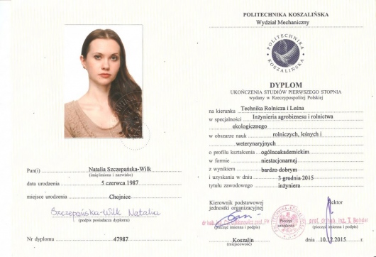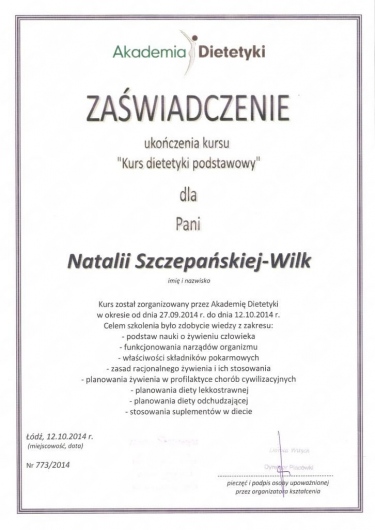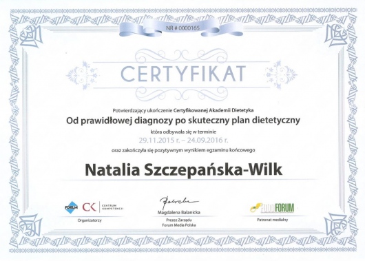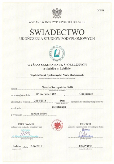 Dyplom dietetyka uzyskałam w Akademii Dietetyki w Szczecinie oraz Gdańsku. Ukończyłam studia podyplomowe na kierunku dietoterapia w Wyższej Szkole Nauk Społecznych w Lublinie a tytuł inżyniera agrobiznesu i rolnictwa ekologicznego uzyskałam na Politechnice Koszalińskiej. Tytuł magistra towaroznawstwa zdobyłam na Uniwersytecie Morskim w Gdyni.