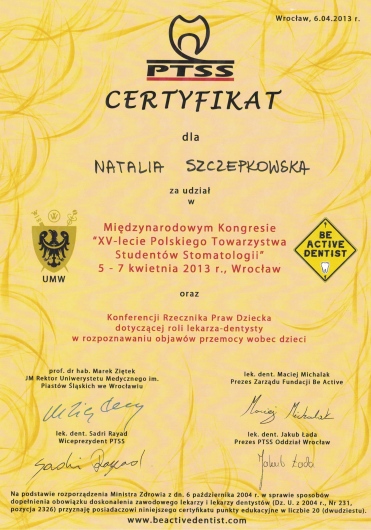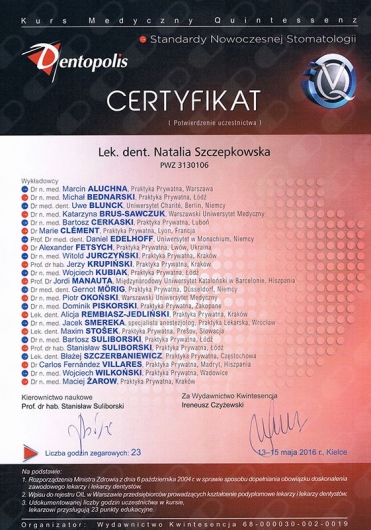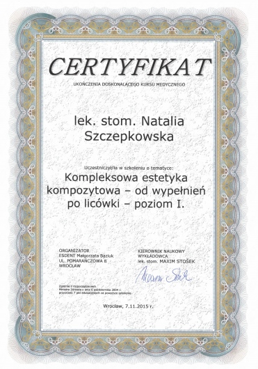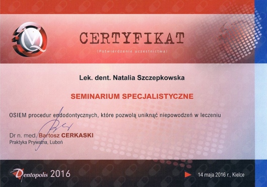 Nie wiem od czego zacząć. Pierwszy raz spotkałam się ze specjalistą, który poświęcił tyle czasu ile było niezbędne, bez uczucia presji upływającego czasu i z pełnym poszanowaniem dla moich oczekiwań. Leczenie było długie, ponieważ dużo było do zrobienia, ale zachwycające jest dla mnie to, że Pani Natalia jako specjalista stawia na wysoką jakość usługi (co w dzisiejszych czasach jest wręcz rzadkością, albo tylko się o tym mówi, a ma się to nijak do tego jak wychodzi w rzeczywistości). Pani stomatolog, z której usług korzystałam wcześniej, wymieniała mi plomby w 15 minut jedną! Okazało się po latach, że w tych miejscach, gdzie były one wymieniane, było to zrobione niedokładnie, co miało takie konsekwencje, a nie inne. Na szczęście, za co jestem wdzięczna losowi niesamowicie, trafiłam do Pani Natalii, która jest absolutnym objawieniem! Specjalista wysokiej klasy, uważny, empatyczny, wszystko szczegółowo wręcz mi wyjaśniła, z dbałością o szczegóły. Jestem pełna podziwu i wdzięczna za ogrom pracy i zaangażowania jaki Pani Natalia jako specjalista i człowiek włożyła w moje leczenie. Wszystkim polecam bez wyjątku. Mam porządek w pyszczku i w końcu uczucie, że jest tam wszystko tak jak powinno być. Żadne słowa nie oddadzą zarówno profesjonalizmu jak i mojej wdzięczności :)