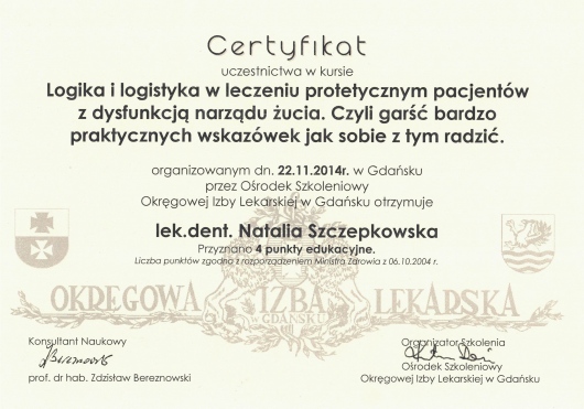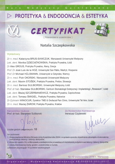 Jaki jest zakres porad oferowanych przez Natalia Szczepkowska?Natalia Szczepkowska to stomatolog. Na podstawie swojego doświadczenia i wykształcenia Natalia Szczepkowska oferuje usługi takie jak: leczenie kanałowe, leczenie próchnicy, Wybielanie zębów, protezy akrylowe, stomatologia estetyczna, badania stomatologiczne, Konsultacja stomatologiczna, wypełnienie kompozytowe, protezy szkieletowe, licówka porcelanowa.