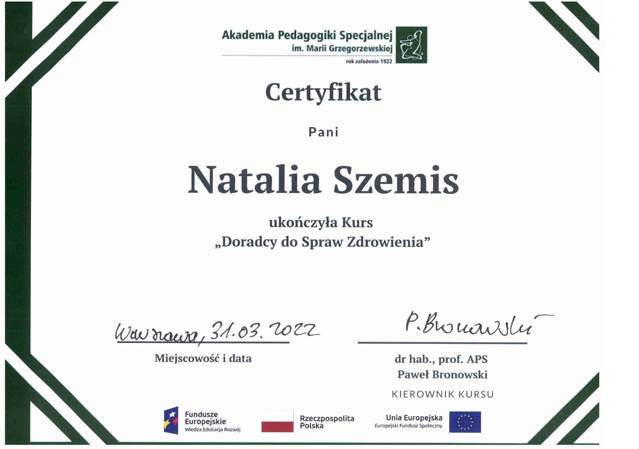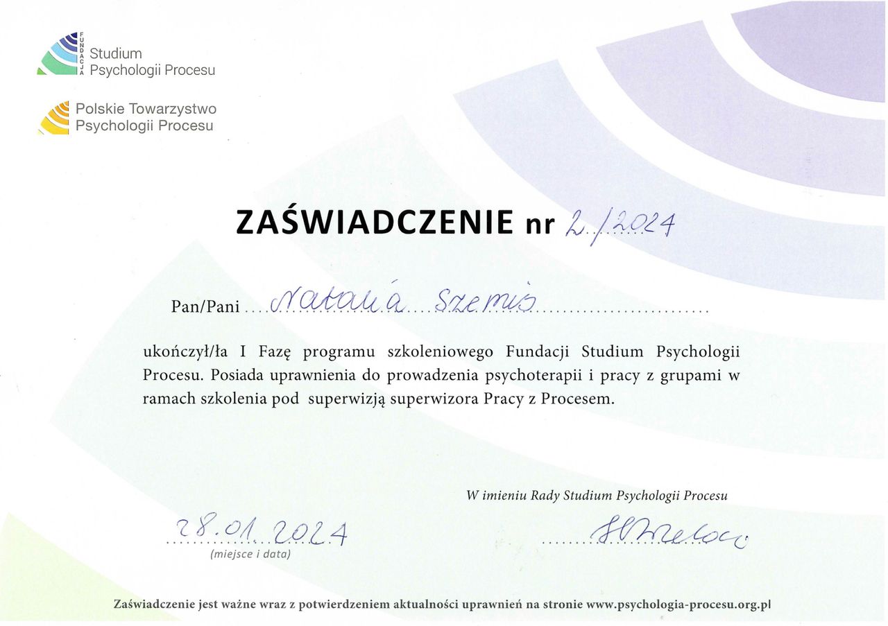 Regularnie podnoszę swoje kompetencje, uczestnicząc w szkoleniach rozwijających umiejętności w obszarze wsparcia psychologicznego i psychoterapii.