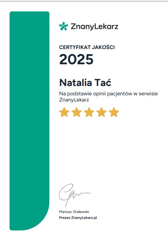 Administratorem danych osobowych jest ZnanyLekarz sp. z o.o. z siedzibą w Warszawie przy ul. Kolejowej 5/7. Informujemy, że po przekazaniu przez nas Twoich danych osobowych wybranemu przez Ciebie Profesjonaliście, staje się on również administratorem Twoich danych osobowych i przetwarza je w celach związanych ze świadczeniem usług medycznych lub innych podobnych.