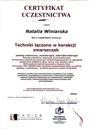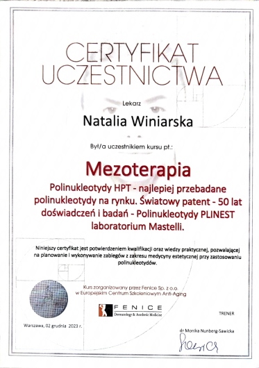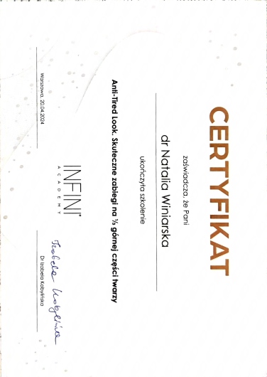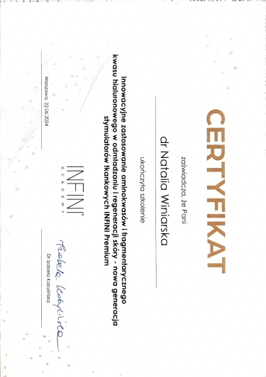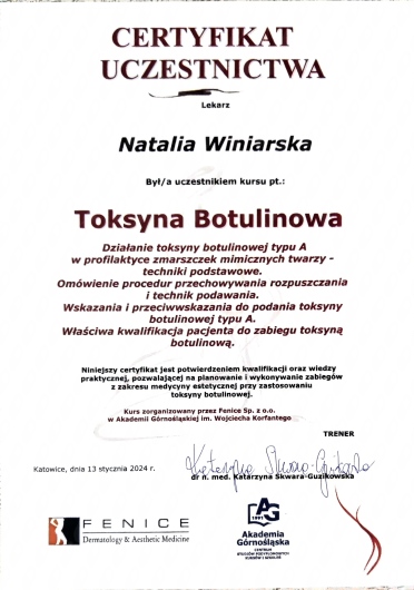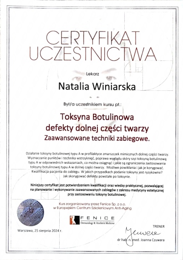 Jaki jest zakres porad oferowanych przez Natalia Winiarska?Natalia Winiarska to lekarz wykonujący zabiegi medycyny estetycznej. Na podstawie swojego doświadczenia i wykształcenia Natalia Winiarska oferuje usługi takie jak: Konsultacja z zakresu medycyny estetycznej, usuwanie zmarszczek, Botoks, Osocze bogatopłytkowe, mezoterapia, konsultacja online, Konsultacja z medycyny estetycznej, Botoks - nadpotliwość, Botoks - kurze łapki, Botoks - linie poprzeczne czoła.