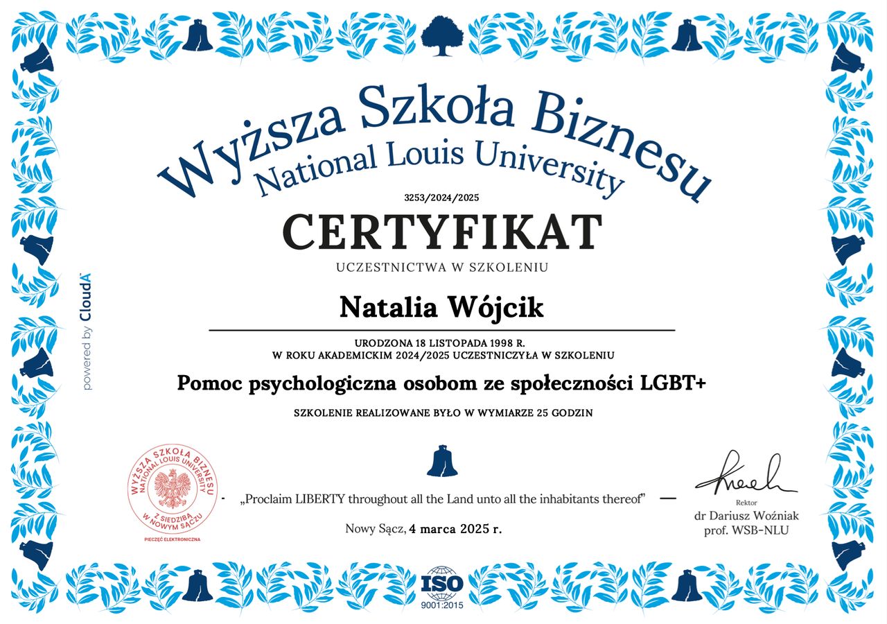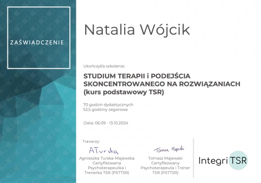 Nazywam się Natalia Wójcik i jestem psychologiem z doświadczeniem w pracy z młodzieżą oraz dorosłymi, specjalizując się w Terapii Skoncentrowanej na Rozwiązaniach (TSR) oraz podejściu integracyjnym. Moje umiejętności rozwijałam nie tylko w praktyce zawodowej, ale również podczas licznych wolontariatów, co pozwoliło mi na jeszcze głębsze zrozumienie różnorodnych potrzeb osób w różnym wieku.