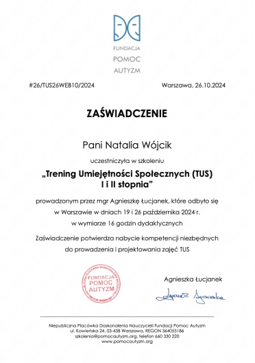 Córka bardzo zadowolona,chętnie chodzi na spotkania i czeka na następne.