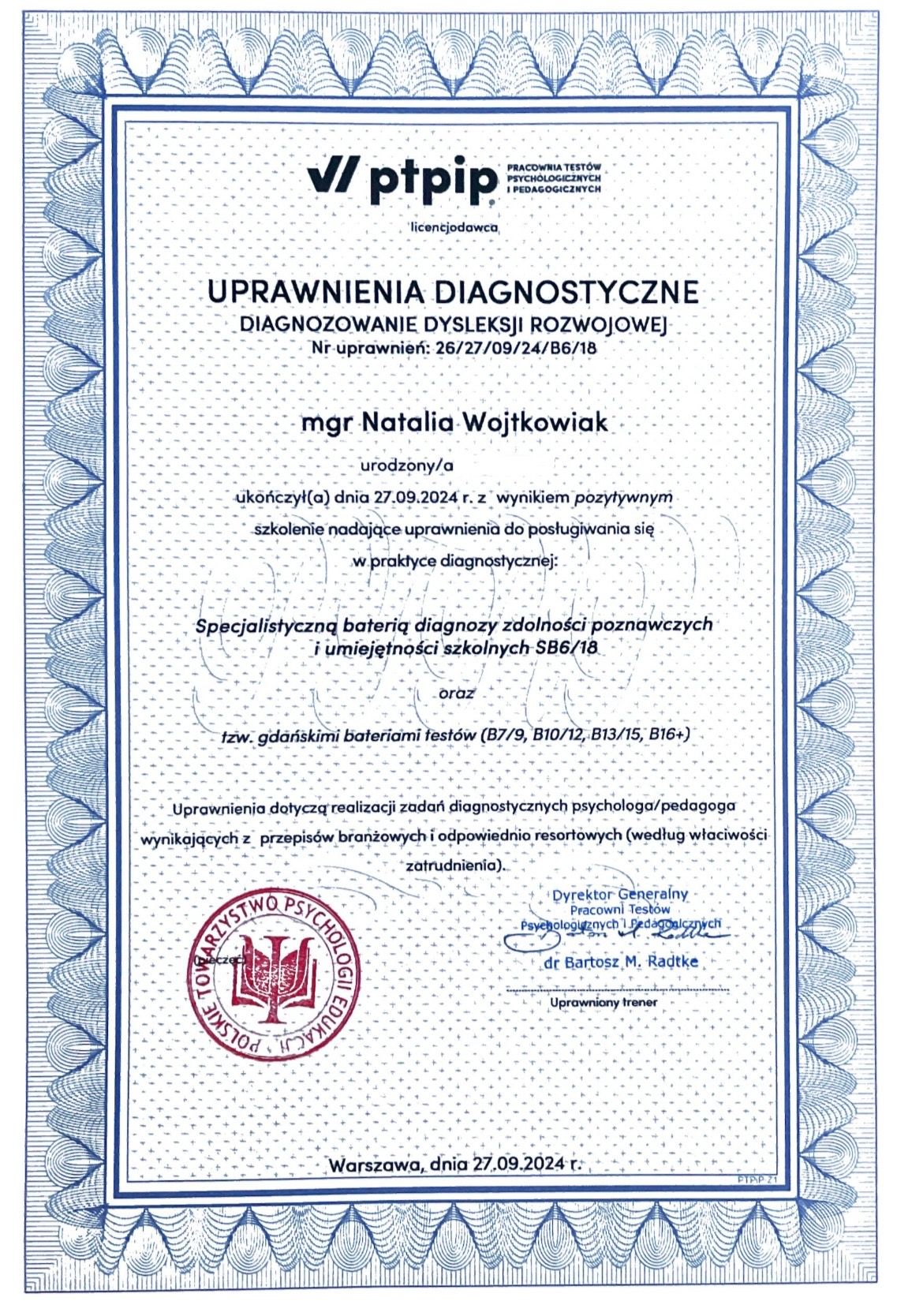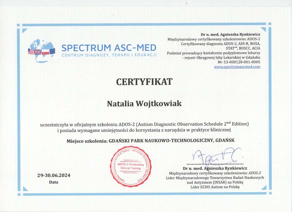 Jaki jest zakres porad oferowanych przez Natalia Wojtkowiak?Natalia Wojtkowiak to psycholog. Na podstawie swojego doświadczenia i wykształcenia Natalia Wojtkowiak oferuje usługi takie jak: Konsultacja psychologiczna dla dzieci i młodzieży, diagnoza ADHD dla dorosłych, Badanie ADOS - 2, Diagnoza zaburzeń osobowości - SCID-5-PD, Diagnoza inteligencji (dorośli i dzieci) - Stanford-Binnet 5, konsultacja diagnostyczna, Konsultacja psychologiczna, poradnictwo dla rodziców, Psychoedukacja dla rodziców.