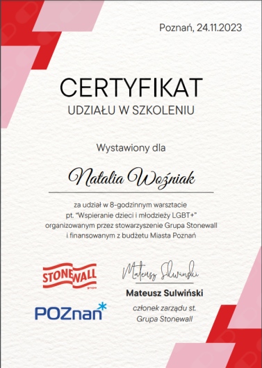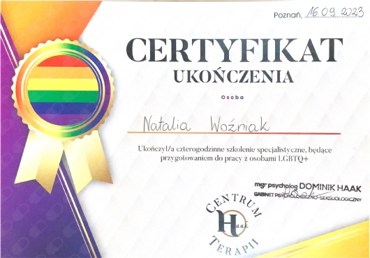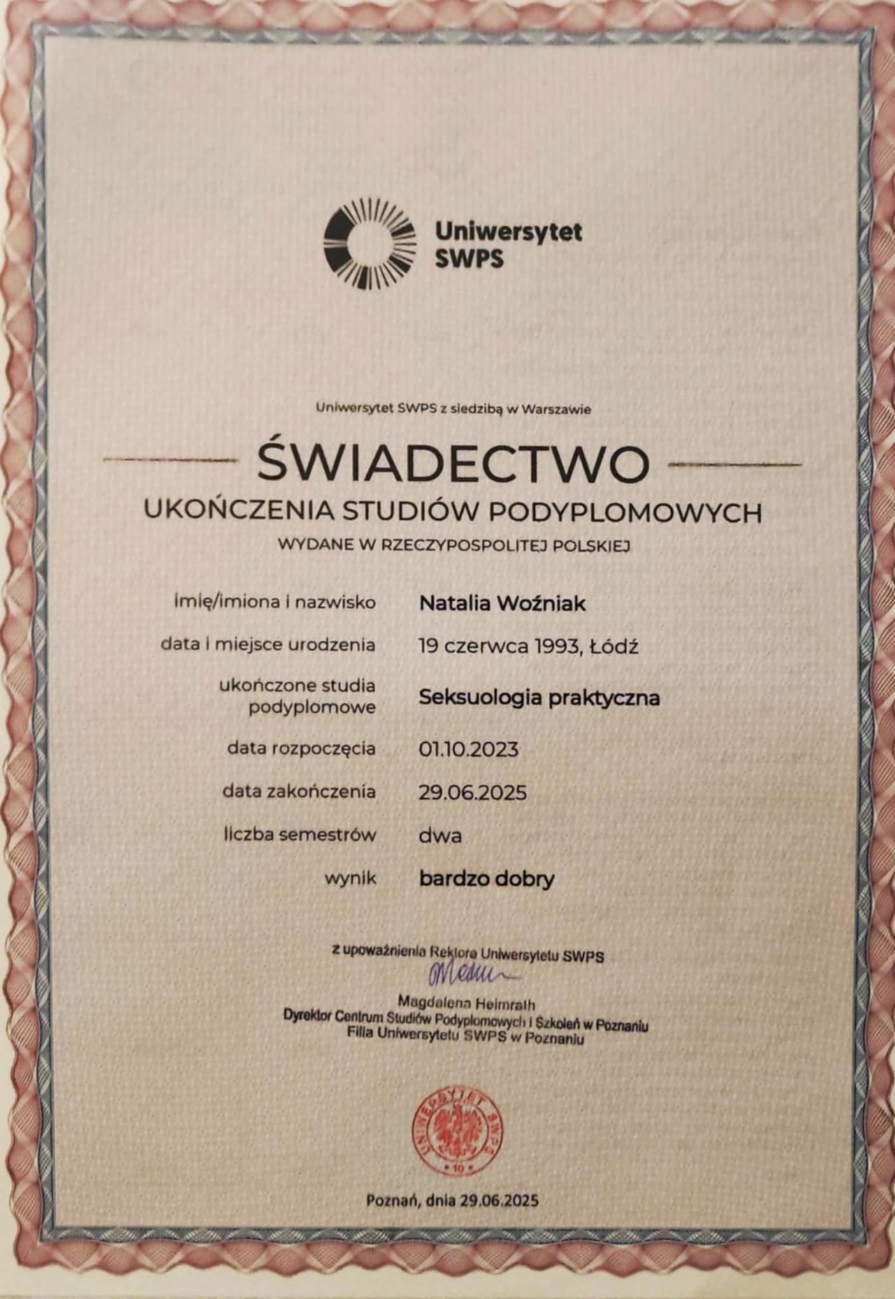 Jestem psycholożką i wykładowczynią na Uniwersytecie Medycznym w Poznaniu (Katedra i Zakład Psychologii Klinicznej). Współtworzę centrum darmowej pomocy psychologicznej dla studentów UMP, jestem współtwórczynią ogólnopolskiej kampanii Świadoma Mama - Stop Depresji oraz współtwórczynią stowarzyszenia SZOK (Stowarzyszenie Zaangażowanych Odważnych Kobiet). Studia psychologiczne ukończyłam na Uniwersytecie Adama Mickiewicza, prócz tego jestem seksuolożką, psycholożką transportu, metodolożką statystyczką oraz certyfikowaną trenerką Proces Communication Model. Aktualnie zaczynam studia o psychodelikach w psychologii i kurs z Coachingu ADHD. Jestem zwolenniczką integracji i inkluzji, czyli włączania osób zagrożonych wykluczeniem do pełnowartościowego życia społecznego. Swoje doświadczenie zdobywałam współpracując z wieloma fundacjami i stowarzyszeniami, tworząc kampanie i projekty społeczne oraz pracując jako psycholożka. W gabinecie staram się stworzyć bezpieczną i przyjazną dla każdego przestrzeń. W pracy preferuje podejście eklektyczne, a więc techniki i strategie dopasowuje indywidualnie pod każdego pacjenta i jego potrzeby. Zajmuję się również diagnozą ADHD - sama jestem osobą nieneurotypową na spektrum ADHD