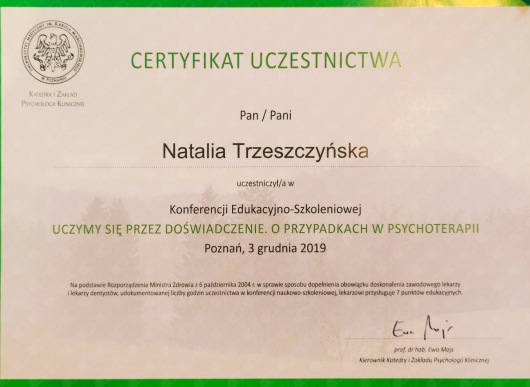 Pani Natalia naprawdę bardzo pomaga pacjentowi zmienić życie na lepsze, a także stara się dla niego ponadprzeciętnie. "Wyciąga z dołka" oraz dodaje sprawczości. Doskonale rozumie trudności pacjenta, nie ocenia ani się nie poddaje. Wspiera, szuka rozwiązań, ale też "mierzy zamiar podług sił", co świadczy o ogromnym profesjonalizmie i realistycznym podejściu. Wkłada w swoją pracę całe serce, pokazując wielkie zaangażowanie. Zawsze znajdzie czas na dokończenie rozmowy. Dzięki niej odzyskałam nadzieję i poczucie, że możemy wspólnie poradzić sobie z tym, co wcześniej wydawało mi się niemożliwe. Z całego serca polecam Panią Natalię każdemu, kto szuka zrozumienia, wsparcia i prawdziwej pomocy - tutaj je znajdziecie.