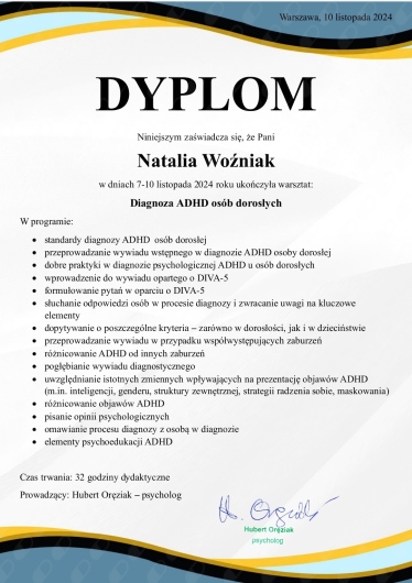 Pani Natalia Woźniak to niezwykle kompetentna i empatyczna specjalistka. Po wielu latach szukania odpowiedzi w końcu trafiłam na kogoś, kto naprawdę mnie zrozumiał. Pani psycholog postawiła trafną diagnozę ADHD, dokładnie wszystko wyjaśniła i pokazała, jak sobie z tym radzić na co dzień. Dzięki jej wsparciu i praktycznym wskazówkom nauczę się lepiej organizować swoją pracę i emocje. Dodatkowo skierowała mnie do świetnego specjalisty, który pomógł dobrać odpowiednie leczenie.