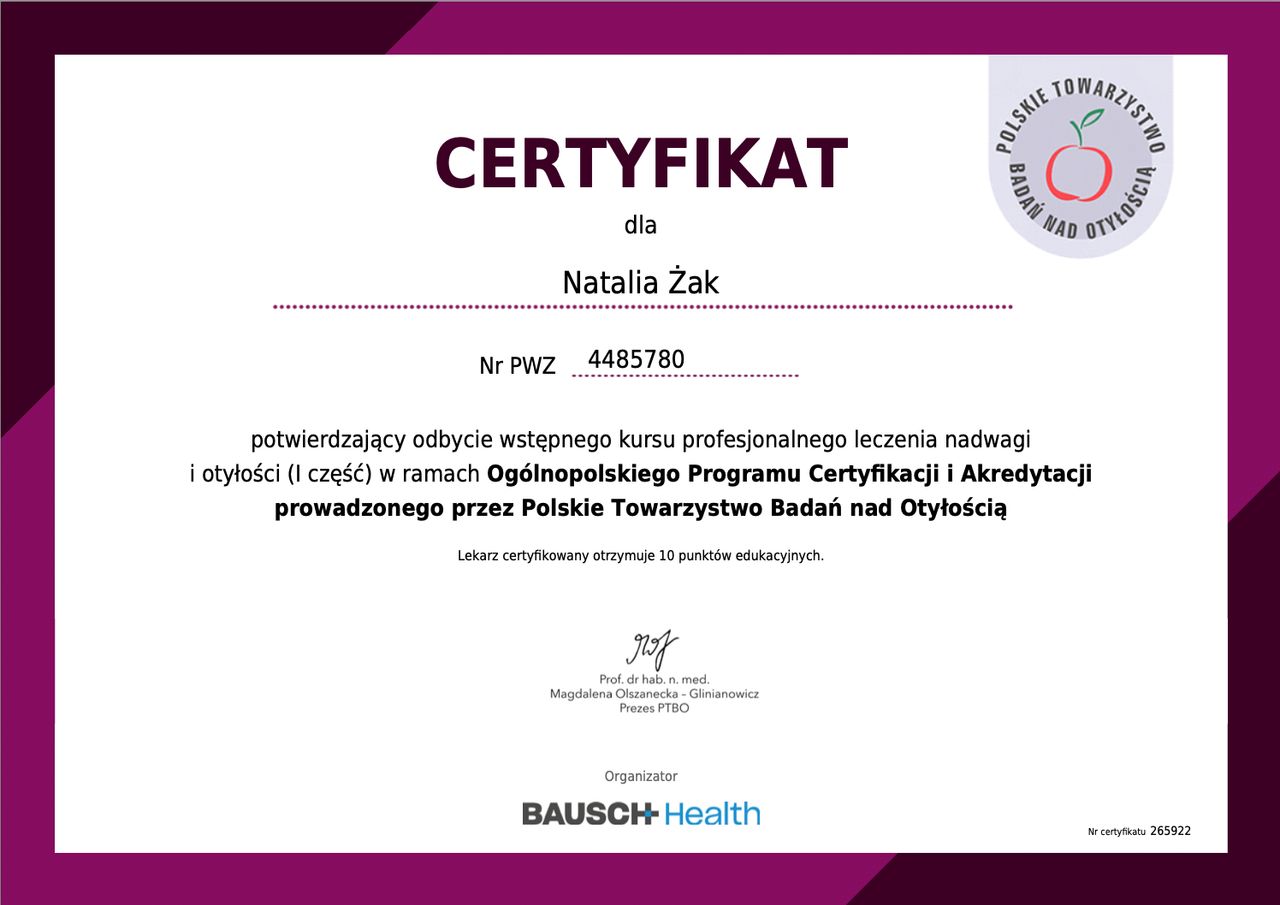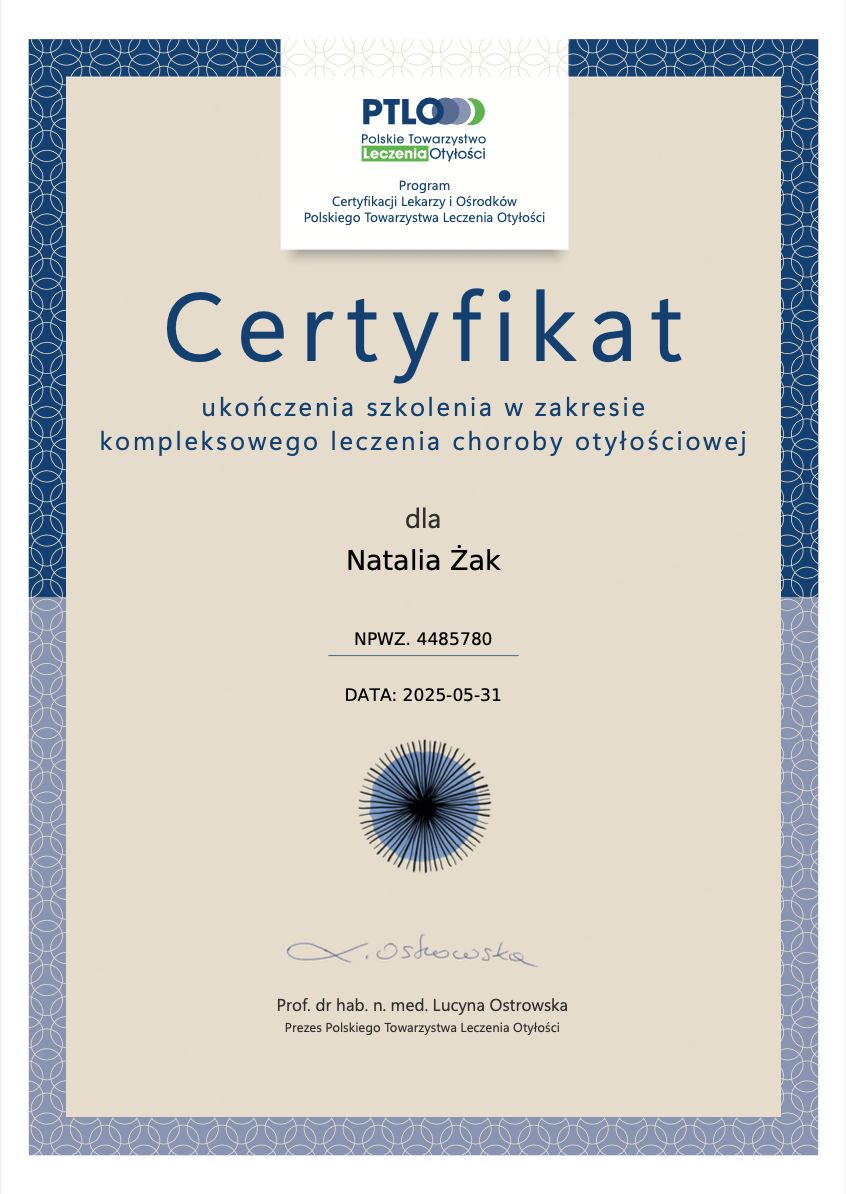 Specjalizuję się w leczeniu nadwagi i otyłości, prowadzeniu zdrowych zmian stylu życia oraz w zabiegach z zakresu medycyny estetycznej – zawsze z naciskiem na naturalne efekty i dobre samopoczucie.