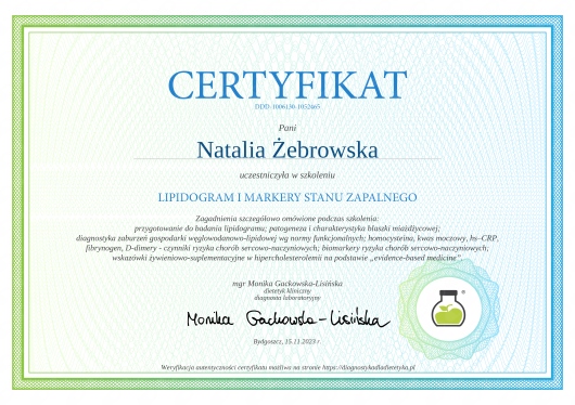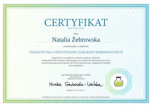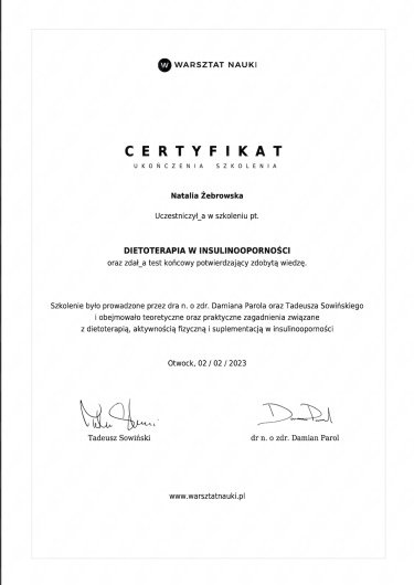 Natalia Żebrowska to dietetyk. Na podstawie swojego doświadczenia i wykształcenia Natalia Żebrowska oferuje usługi takie jak: Konsultacja dietetyczna (kolejna wizyta), Konsultacja dietetyczna, Pakiet 1-miesięcznej współpracy (konsultacja + plan żywieniowy + spotkanie wspierające), Pakiet 3-miesięcznej współpracy, dietoterapia, Analiza składu ciała, konsultacja online.