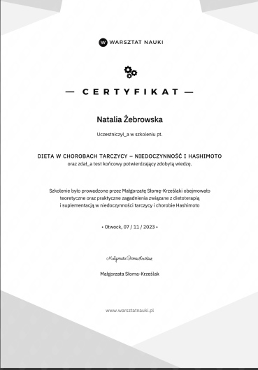 pojęcia. Została włączona suplementacja a pani Natalia poradziła do jakiego lekarza powinnam się zwrócić na dalsze leczenie. Jeżeli chodzi o samą dietę to mam dopasowaną do tego co lubię jeść z uwzględnieniem moich chorób i różnych dolegliwości, które wykluczają sporą ilość produktów z codziennej diety. Dużym