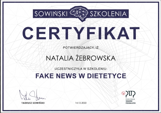 Z Panią Natalią pracuję już kilka miesięcy i jestem bardzo zadowolona z efektów a przede wszystkim jestem pod wrażeniem samej Pani Natalii. Jest bardzo profesjonalna, dociekliwa i patrzy holistycznie na samego pacjenta. Jeszcze żaden lekarz nie spojrzał na mnie tak całościowo jak Pani Natalia. Dieta jest łatwa i szybka (5-20 minut na przygotowanie posiłku). Zauważyłam również, że dzięki przepisom zaproponowanym przez Panią Natalię, powoli uczę się sama tworzyć zbilansowane posiłki. Z łatwością wprowadza się nowe nawyki, które naprawdę mogą dużo zmienić. Kontakt z Natalią jest bezproblemowy i szybki. Za każdym razem gdy mam jakieś wątpliwości, dostaję jasną odpowiedź (u Natalii nie ma głupich pytań). Po różnych doświadczeniach z dietetykami, długo zwlekałam z rozpoczęciem nowej współpracy z dietetykiem i jestem ogromnie wdzięczna, że trafiłam na Panią Natalię! Jeżeli ktoś się zastanawia, czy warto - na 100% warto!