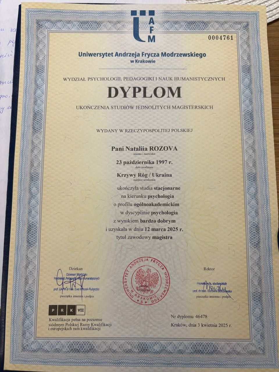Jaki jest zakres porad oferowanych przez Nataliia Rozova?Nataliia Rozova to psycholog. Na podstawie swojego doświadczenia i wykształcenia Nataliia Rozova oferuje usługi takie jak: Konsultacja psychologiczna, konsultacja psychologiczna w języku ukraińskim, konsultacja psychologiczna w języku rosyjskim, psychoterapia w języku ukraińskim, Psychoterapia w języku rosyjskim / Психотерапия на русском языке, Psychoterapia poznawczo-behawioralna, interwencja kryzysowa, psychoedukacja.