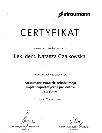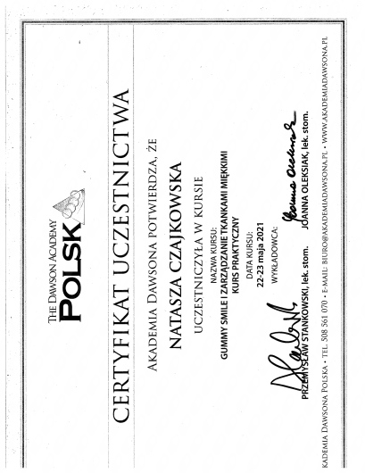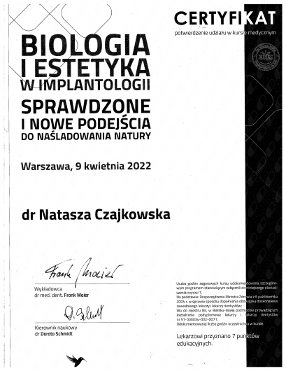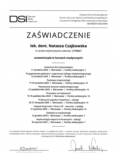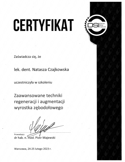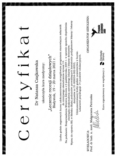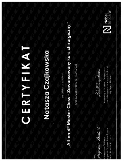 Od 2015 roku moja praca zawodowa jest ściśle ukierunkowana na chirurgie i to właśnie w tej dziedzinie stale podnoszę swoje kwalifikacje,czego dowodem jest ukończone Curriculum Implantologiczne w 2021 roku.