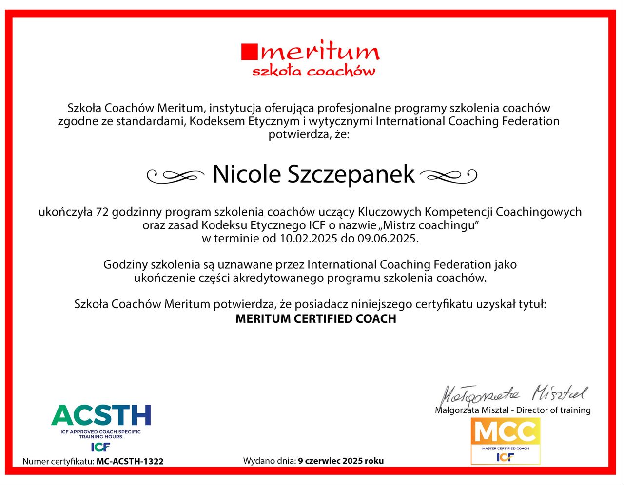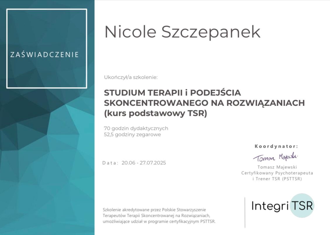 Zgłosiłam się do Pani psycholog Nicole w momencie, kiedy naprawdę nie wiedziałam już, co dalej. Wszystko mnie przytłaczało i miałam wrażenie, że kompletnie się pogubiłam. Już po pierwszej rozmowie poczułam, że ktoś naprawdę mnie słucha i rozumie, bez oceniania. To było ogromne poczucie ulgi. Dzięki kilku spotkaniom nauczyłam się lepiej rozpoznawać, co się ze mną dzieje, i powoli zaczęłam wracać do równowagi. Czułam się zaopiekowana i potraktowana z dużym szacunkiem. Naprawdę polecam, jeśli ktoś czuje, że grunt usuwa mu się spod nóg..