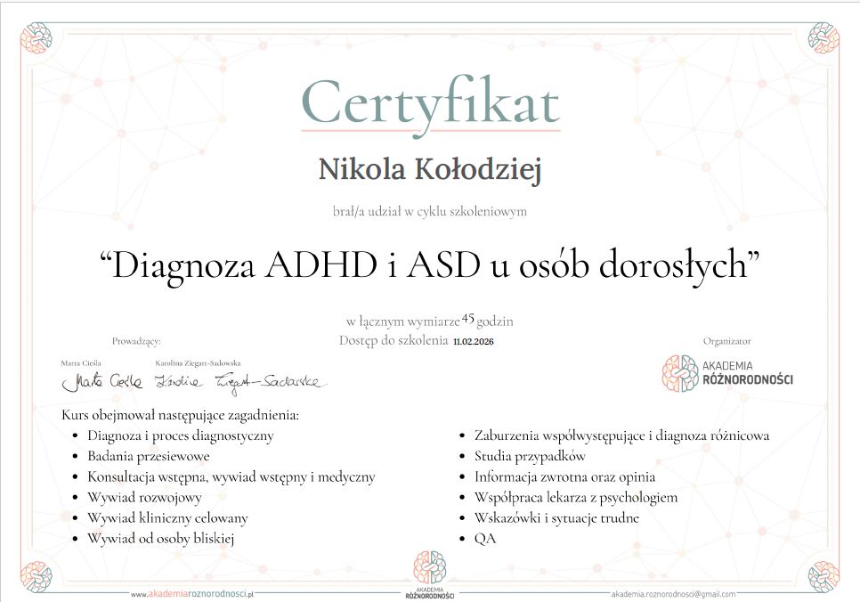 Czy Nikola Kołodziej przyjmuje online, bez konieczności pojawiania się w placówce?Tak, Nikola Kołodziej oferuje konsultacje online. Wybierz opcję „konsultacja online” przy umawianiu wizyty, a zobaczysz dostępne terminy.