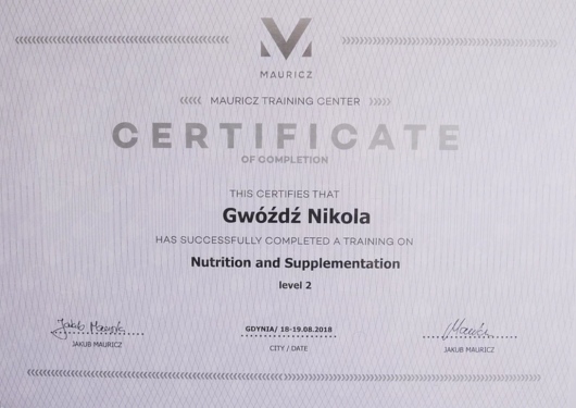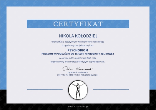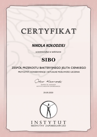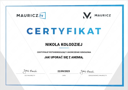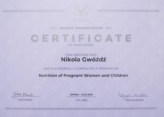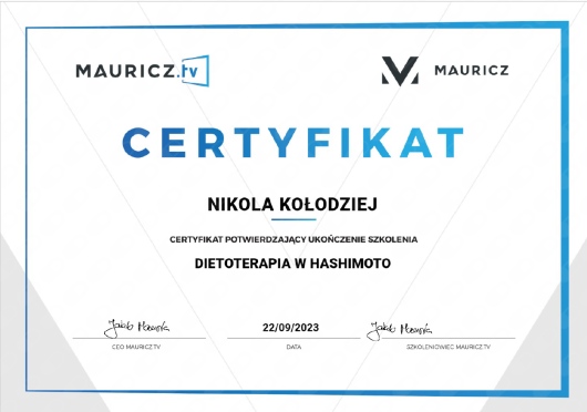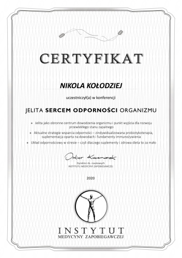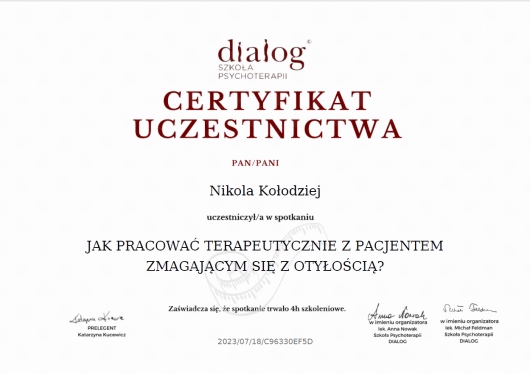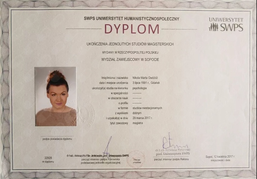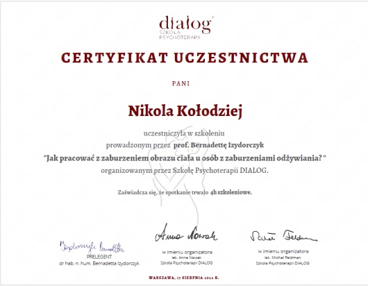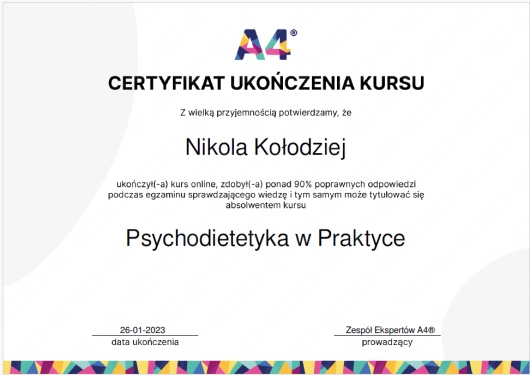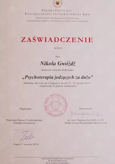 Ukończyłam jednolite 5-cio letnie studia magisterskie z psychologii na Uniwersytecie SWPS i stale podnoszę swoje kwalifikacje poprzez liczne szkolenia i certyfikacje. Wśród ukończonych szkoleń są m.in.: „Interwencja Kryzysowa” – Szkoła Psychoterapii Dialog, „Psychoterapia osób jedzących za dużo” – Polski Instytut Psychoterapii Integratywnej MKN, „Praca z zaburzeniami obrazu własnego ciała u osób z zaburzeniami odżywiania” – Szkoła Psychoterapii Dialog, „Praca terapeutyczna z osobą zmagającą się z otyłością” – Szkoła Psychoterapii Dialog, „Terapia Psychobiomu (Terapia Mikrobioty Jelitowej)” – Instytut Medycyny Zapobiegawczej „Leczenie SIBO” – Instytut Medycyny Zapobiegawczej, „Psychodietetyka w praktyce” – A4 , „Dietetyka i Suplementacja 1, 2 i 3 poziom” – Mauricz Training Center, „Odżywianie kobiet w ciąży i dzieci” – Mauricz Training Center ,„Dietoterapia w Hashimoto”, „Jak uporać się z anemią”, „Jak zwalczyć depresję”, „Jak poprawić libido”. Uczestniczyłam również w wielu konferencje naukowych m.in.: „Jelita sercem odporności organizmu”, „Konferencja REPs” ,„Konferencja Psychodietetyki i Dietetyki”