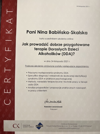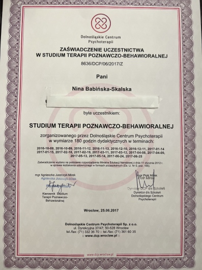 Pani Nina to definitywnie jedna z najcieplejszych i najbardziej empatycznych osób jakie w życiu spotkałam. Dzięki terapii nauczyłam się radzić ze swoimi problemami, emocjami, negatywnymi uczuciami, ale też jak ulokować te pozytywne. Dzięki ogromnej wiedzy oraz doświadczeniu Pani Niny, całą terapię postrzegam jako najważniejszy moment w moim rozwoju. Myślę, że dzięki naprawdę niesamowitej atmosferze, jaka panowała na naszych spotkaniach, było mi dużo łatwiej poradzić sobie ze wszystkimi problemami. Na każde pytanie dostawałam bardzo rozbudowaną i pełną zaangażowania odpowiedź. Terapia bardzo mnie podbudowała i pokazała przemyślenia, do których nie byłam i nie byłabym w stanie dojść sama. Warto, również dodać jak otwartą i tolerancyjną osobą jest Pani Nina. Nigdy nie poczułam się osądzona czy gorsza. Natomiast, czułam ogromne wsparcie i troskę. Nie mogłabym pominąć faktu, że terapia była świetnie dostosowana do moich potrzeb i prowadzona bardzo profesjonalnie. Przez cały jej czas trwania nie jestem w stanie powiedzieć ani jednego, złego słowa o samej terapeutce czy sposobie jaki prowadziła mnie przez ten okres. Uważam, że terapia była dla mnie ogromnym przełomem i jestem niesamowicie wdzięczna Pani Ninie za to jak się mną zaopiekowała, a przede wszystkim jak bardzo mi pomogła. Z całego serca polecam i wręcz zachęcam do przyjścia właśnie do niej.