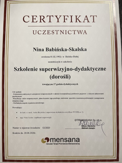 Pani Nina była wspaniałym przewodnikiem w procesie zmian. Ciepła, empatyczna terapeutka, która potrafiła stworzyć w swoim gabinecie bezpieczną przystań w której mogłam omówić wszystkie swoje problemy, bez poczucia wstydu i bycia ocenianą. Zawsze czułam, że pani Nina angażuje się w nasze spotkania i szczerze chce dla mnie jak najlepiej. Wiedziałam, że mogę jej zaufać, że to "mój" człowiek. Czasem zadawała niewygodne pytania, czasem mnie to drażniło, ale z perspektywy czasu wiem, że to właśnie te pytania były przełomowe i pozwalały mi iść dalej, do kolejnego kroku w terapii. Terapia u pani Niny zmieniła moje życie - jakkolwiek górnolotnie to brzmi. Znacząco poprawiła mój komfort życia, pozwoliła zrozumieć pewne schematy, rozpracować problemy, by już nie wydawały się takie wielkie i nie do przeskoczenia. Dzięki terapii coraz więcej rozumiem, potrafię się zatrzymać i zapytać sama siebie dlaczego coś mnie tak drażni czy złości. Wzrosło moje zrozumienie siebie, swoich emocji i myśli, ale także otoczenia. Pani Nina dała mi skrzynkę z narzędziami - dzięki niej po zakończonej terapii wiem co robić, kiedy przychodzi słabszy moment. Dzięki sporej mojej pracy własnej i zaangażowaniu pani Niny, udało mi się dojść do psychicznej równowagi w 6 miesięcy i zakończyć terapię silniejsza i bardziej pewna siebie. 6 miesięcy wydawało mi się dość krótko, ale terapeutka była pewna, że poradzę sobie sama. Nigdy nie przeciągała terapii, nie naciągała na dalsze spotkania.
