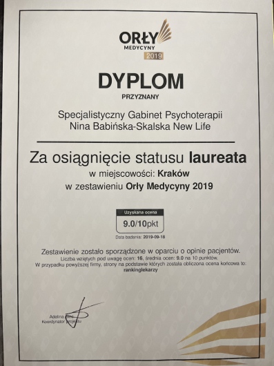 Do Pani Niny zgłosiłam się przechodząc kryzys na wielu płaszczyznach mojego życia. Długo zwlekałam nad tym by podjąć się terapii, zawsze myślałam, że poradzę sobie sama bo kto jak nie ja? Cieszę się, że mój pierwszy wybór i intuicja mnie nie zawiodły, bo wizyty u Pani Niny były najlepszym lekarstwem na moje problemy, rozterki. Terapia trwała blisko rok, wylałam na niej mnóstwo łez (nie wiem czy trafił się Pani Ninie tak płaczliwy pacjent) ale te łzy były niesamowitym oczyszczeniem i dzięki ogromnemu wsparciu podczas tej terapii jestem dzisiaj w zupełnie innym miejscu swojego życia, nie boję się podejmować wyzwań. Pani Nina jest niebywale ciepłą osobą, angażuje się, słucha i nie ocenia. Zawsze trafia z pytaniami w punkt, czasami ciężko powiedzieć coś na głos przed samym sobą a podczas wizyt nie czuć wstydu. Najlepszym podsumowaniem efektów mojej terapii były słowa mojej przyjaciółki "znów jesteś taka jak na początku liceum". Dzięki wizytom u Pani Niny inaczej patrzę na siebie, miewam chwile zwątpienia jak każdy ale szybko się podnoszę. Zdecydowanie polecam!
