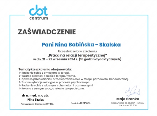Jaki jest zakres porad oferowanych przez Nina Babińska-Skalska?Nina Babińska-Skalska to psycholog, psychoterapeuta. Na podstawie swojego doświadczenia i wykształcenia Nina Babińska-Skalska oferuje usługi takie jak: Psychoterapia, Konsultacja psychologiczna, konsultacja psychoterapeutyczna.