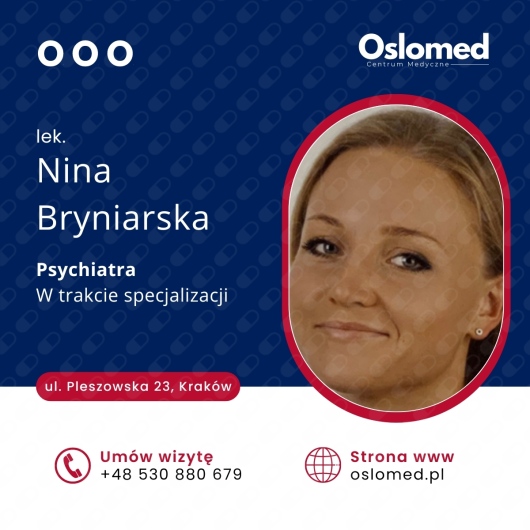 Lek. Nina Bryniarska jest specjalistą psychiatrii dorosłych i młodzieży prowadzącym praktykę w Krakowie. Od 2020 roku zajmuje się diagnozowaniem i leczeniem pacjentów od 16. roku życia, prowadząc konsultacje w atmosferze spokoju i zaufania.