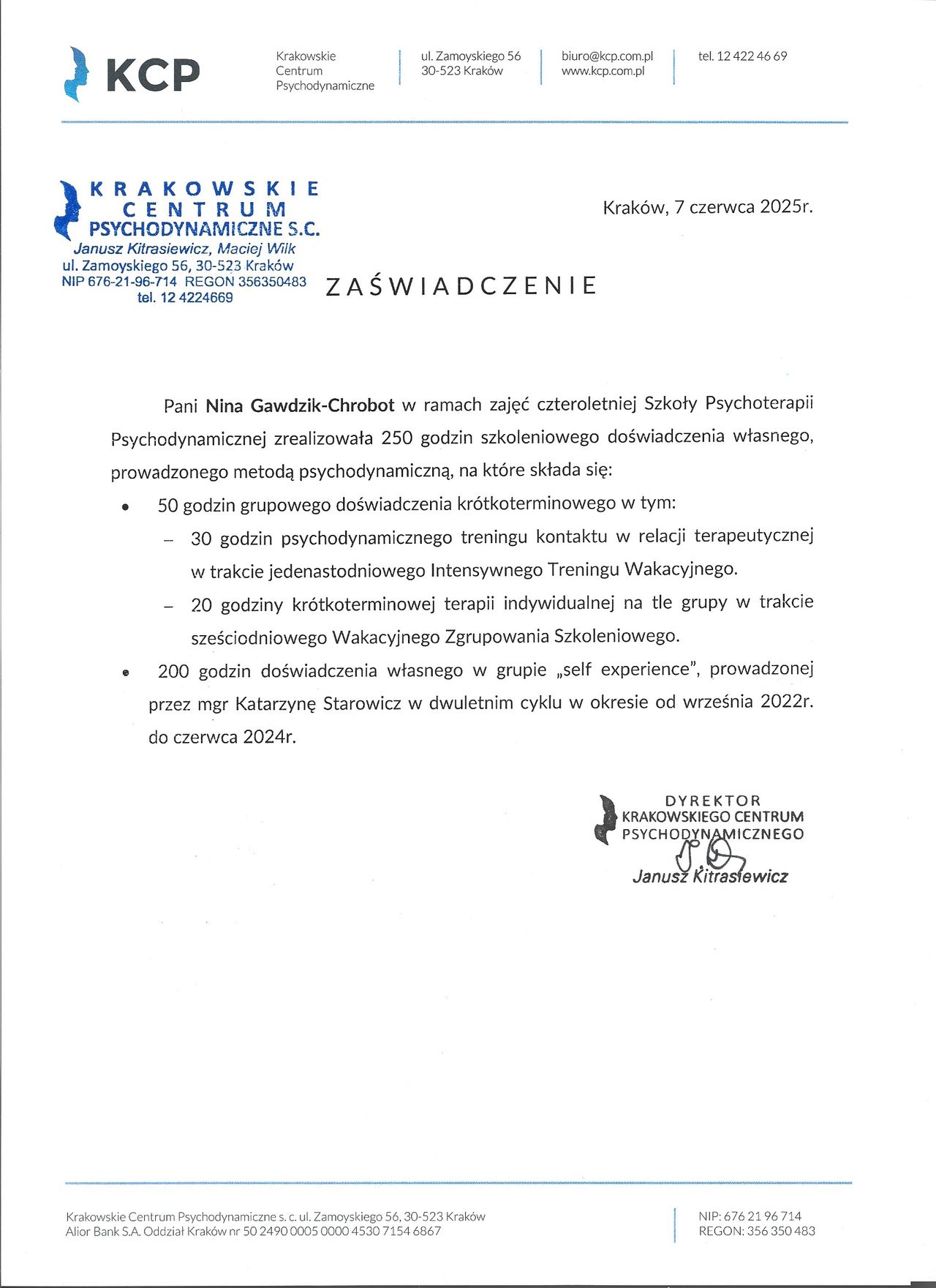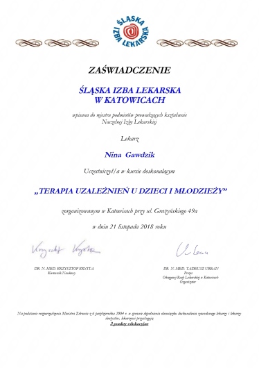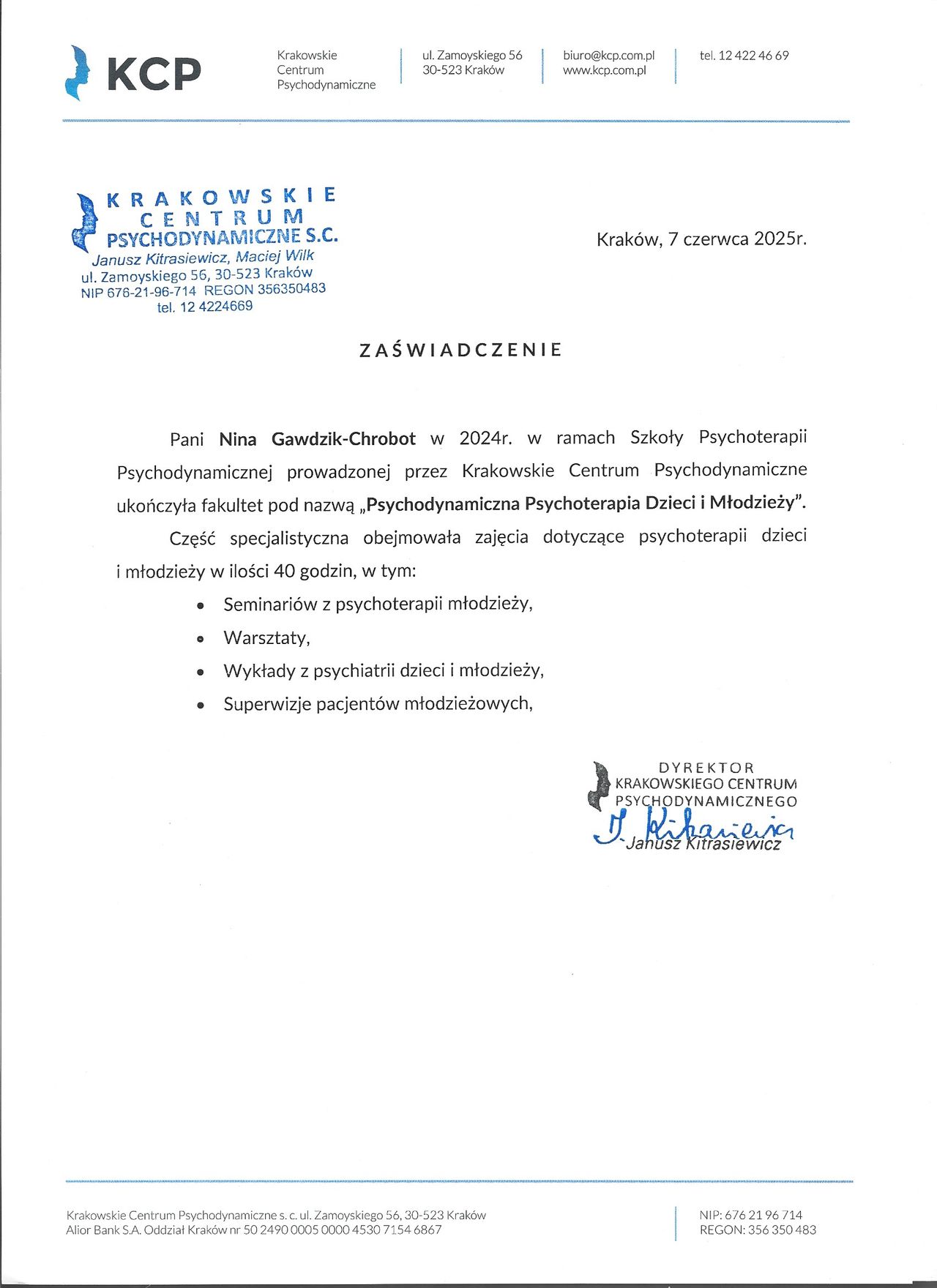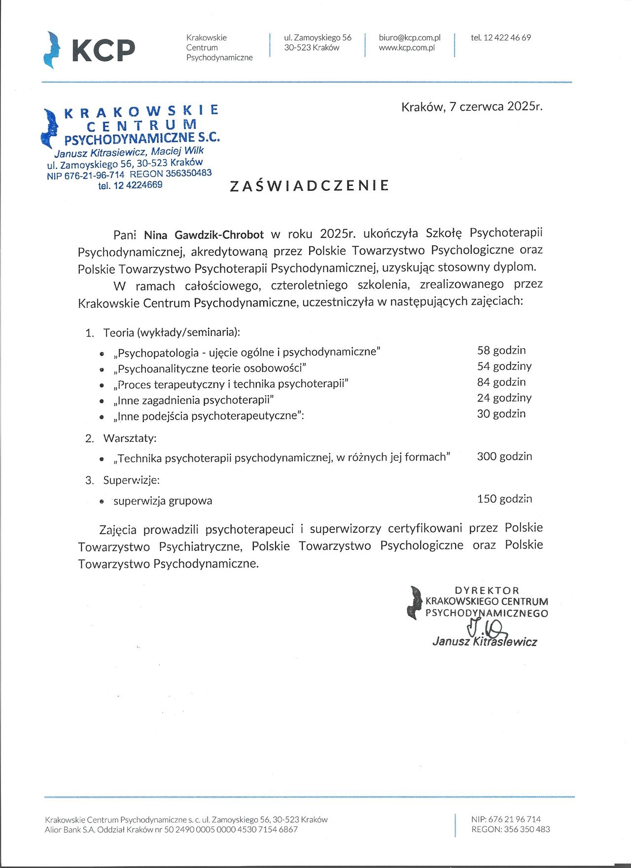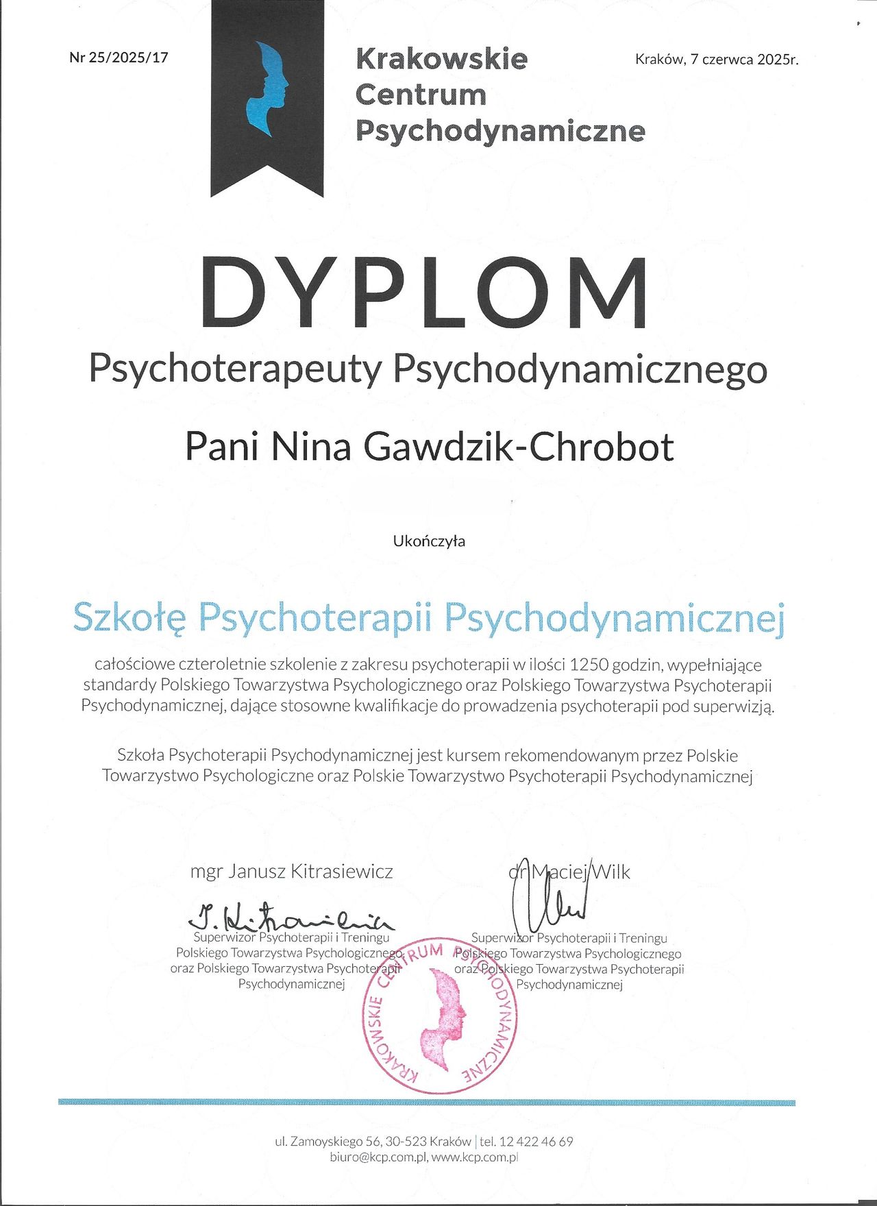Jestem specjalistą psychiatrii oraz psychoterapeutą, pracującym w nurcie psychodynamicznym. Ukończyłam czteroletnie szkolenie w Krakowskim Centrum Psychodynamicznym, uzyskując gruntowne przygotowanie do pracy psychoterapeutycznej. Specjalizację z psychiatrii odbywałam w Klinicznym Oddziale Psychiatrii w Tarnowskich Górach.
