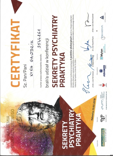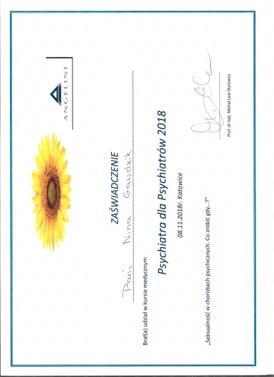 Mam doświadczenie w leczeniu pacjentów ze współwystępującymi chorobami somatycznymi, które zdobyłam m.in. w Oddziale Psychiatrycznym dla Chorych Somatycznie w Sosnowcu.