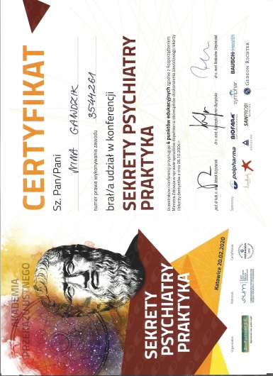 Stale podnoszę swoje kwalifikacje, uczestnicząc w konferencjach, szkoleniach i zjazdach naukowych. Regularnie korzystam z indywidualnej superwizji, dbając o jakość mojej pracy terapeutycznej.