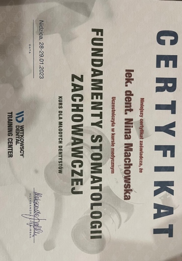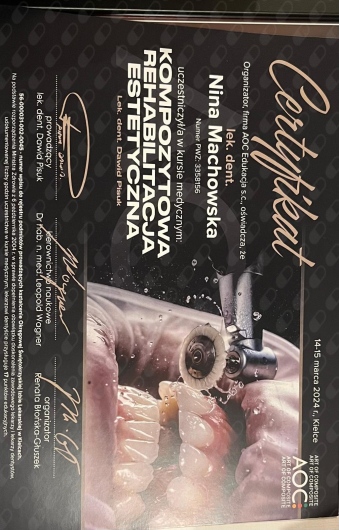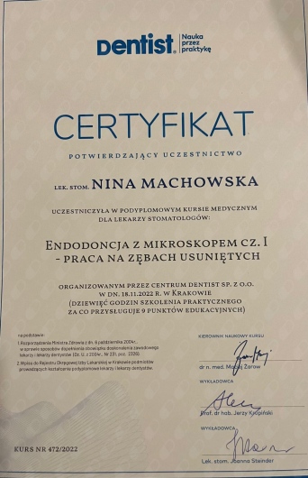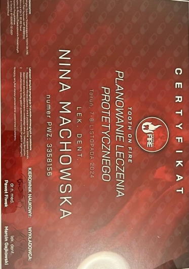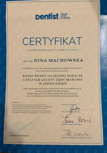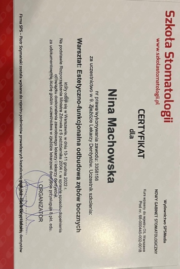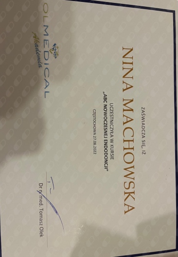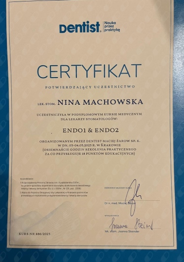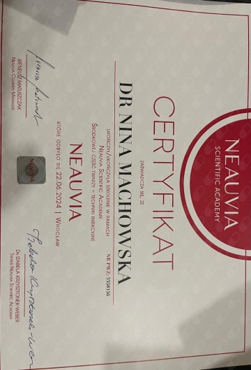 Jaki jest zakres porad oferowanych przez Nina Machowska?Nina Machowska to stomatolog, lekarz wykonujący zabiegi medycyny estetycznej. Na podstawie swojego doświadczenia i wykształcenia Nina Machowska oferuje usługi takie jak: Konsultacja stomatologiczna, leczenie kanałowe zęba 1-3, leczenie kanałowe zęba 4-5, leczenie kanałowe zębów trzonowych, wypełnienie kompozytowe, fluoryzacja zębów, wybielanie zęba martwego, ekstrakcja zęba, wypełnienie estetyczne, uzupełnienia typu inlay, onlay.
