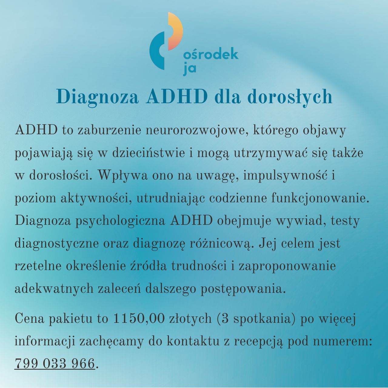 W Ośrodku JA wszystkie osoby diagnozujące są psychologami i psychoterapeutami lub psychotraumatologami. Oznacza to, że nasi specjaliści posiadają wiedzę, doświadczenie i wykształcenie, które pozwalają na dokonanie profesjonalnej i rzetelnej diagnozy z uwzględnieniem całościowego funkcjonowania danej osoby. Kluczowa w procesie diagnostycznym jest wiedza dotycząca różnego rodzaju zaburzeń i umiejętność rozróżnienia czy dane objawy obserwowane u pacjenta rzeczywiście wynikają z Zespołu Nadpobudliwości Psychoruchowej z Deficytem Uwagi, czy też z innego zaburzenia. U naszych diagnostów uzyskasz profesjonalną diagnozę w kierunku ADHD.