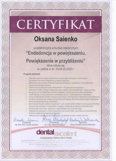 Jaki jest zakres porad oferowanych przez Oksana Saienko?Oksana Saienko to stomatolog. Na podstawie swojego doświadczenia i wykształcenia Oksana Saienko oferuje usługi takie jak: Konsultacja stomatologiczna, lakowanie zębów, leczenie próchnicy, piaskowanie, profilaktyka próchnicy, scaling, stomatologia estetyczna, usunięcie kamienia nazębnego, Wybielanie zębów, wypełnienie kompozytowe.