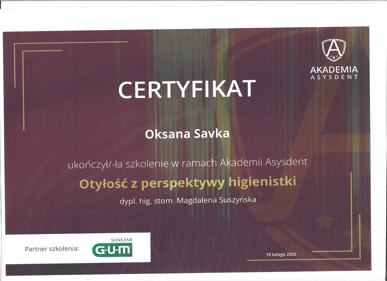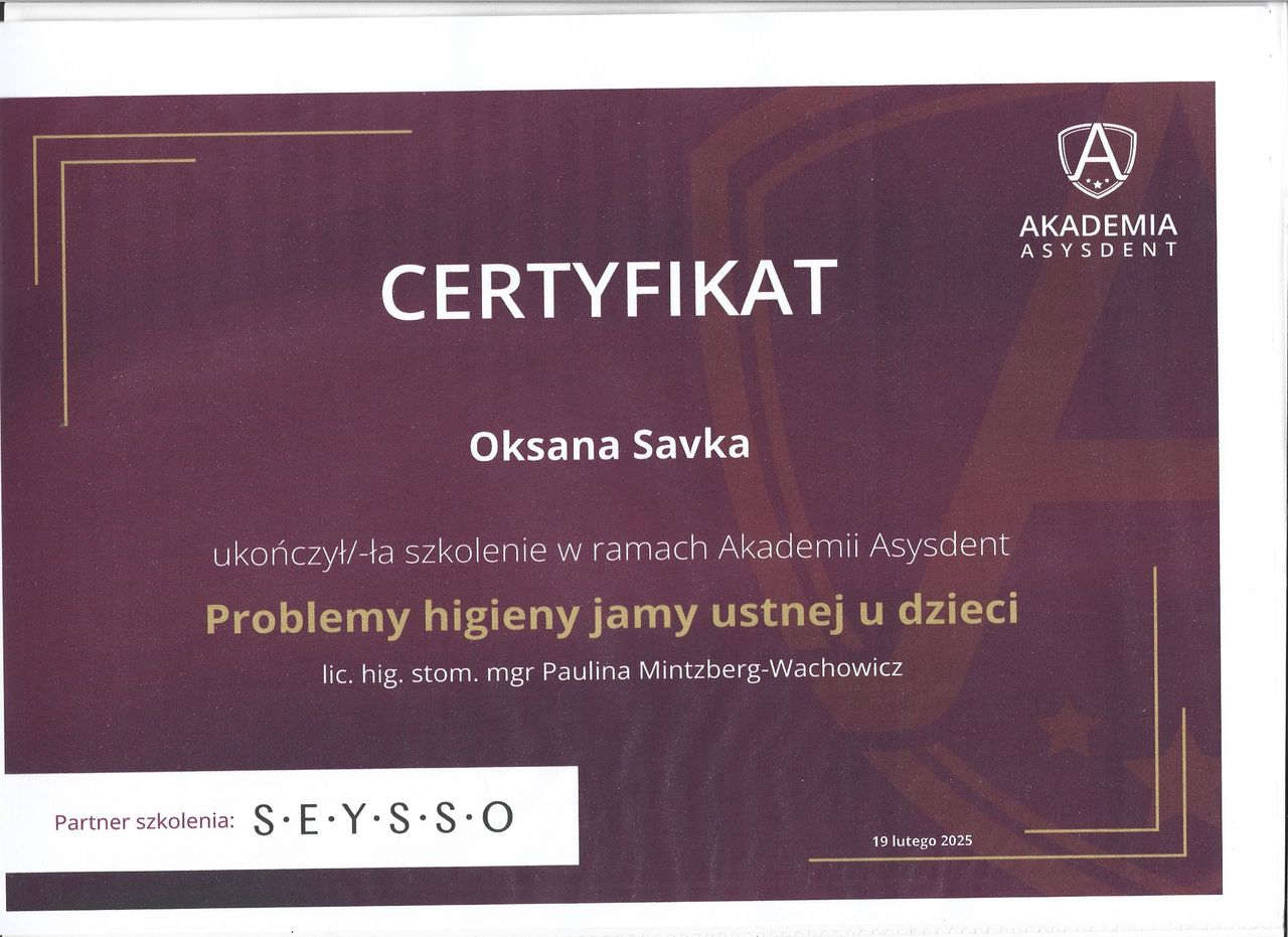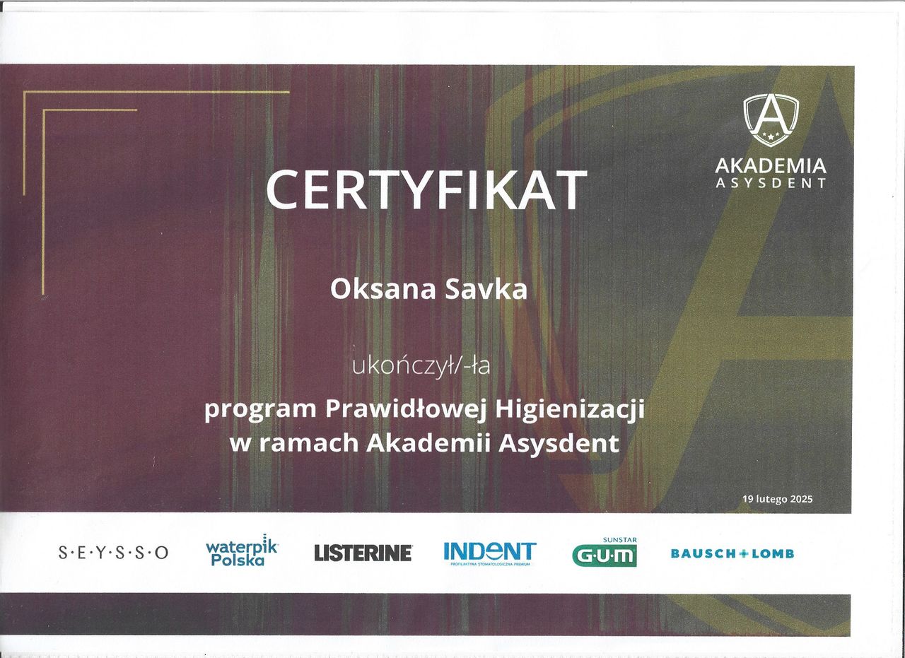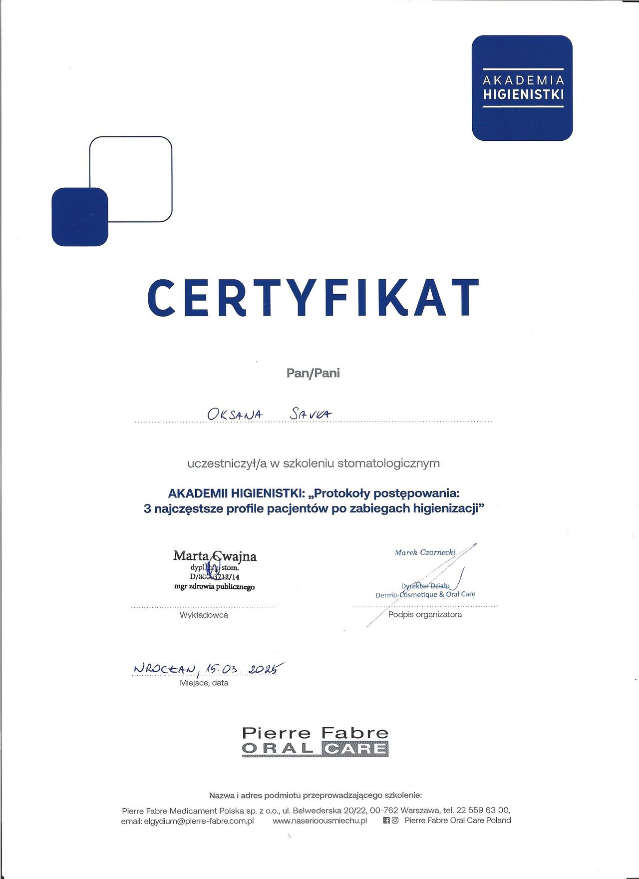 Jaki jest zakres porad oferowanych przez Oksana Savka?Oksana Savka to higienistka/higienista stomatologiczny. Na podstawie swojego doświadczenia i wykształcenia Oksana Savka oferuje usługi takie jak: higienizacja, piaskowanie, usuwanie kamienia nazębnego, fluoryzacja zębów, pakiet higienizacyjny z instruktażem.