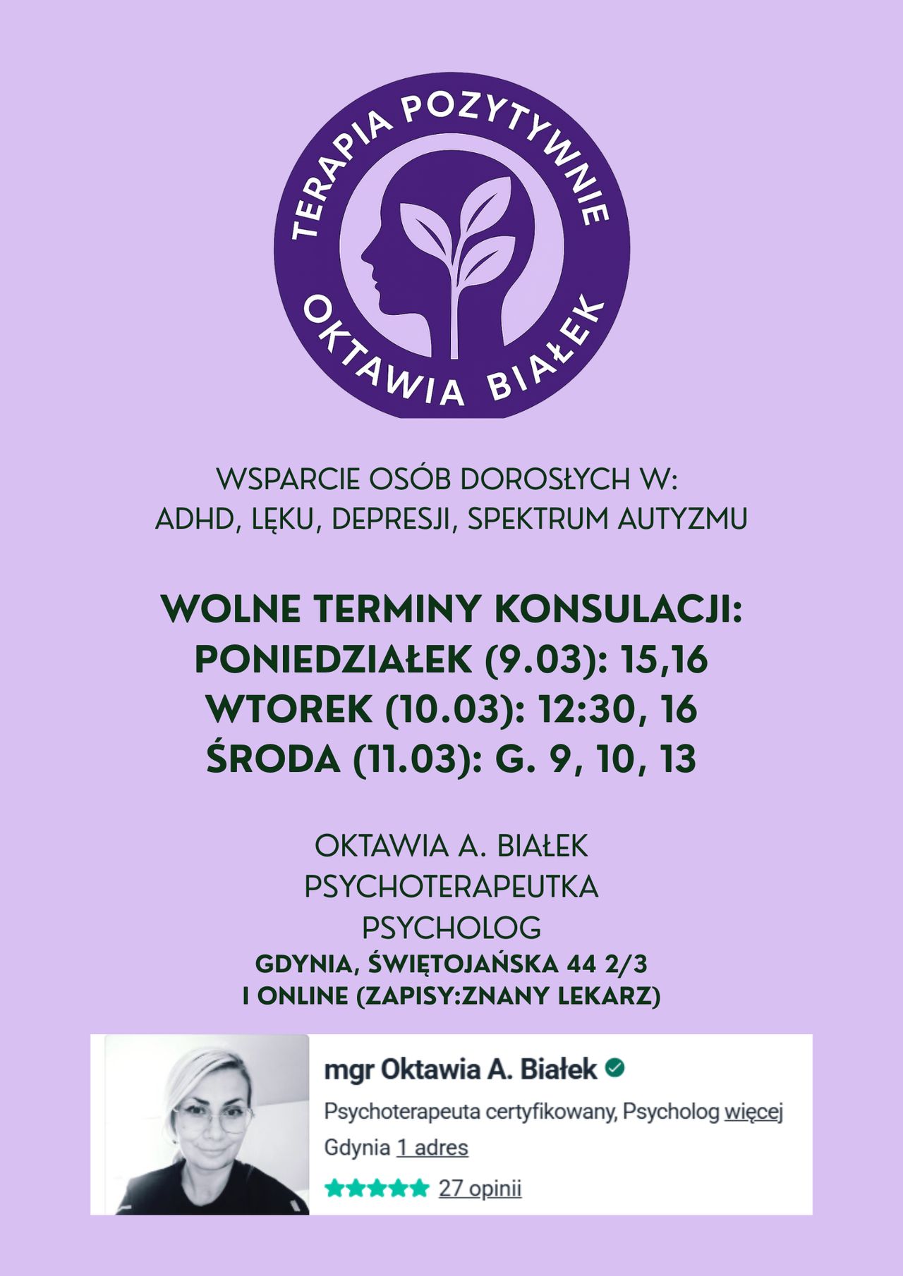 Wolne terminy konsultacji psychoterapeutycznych w nadchodzącym tygodniu: