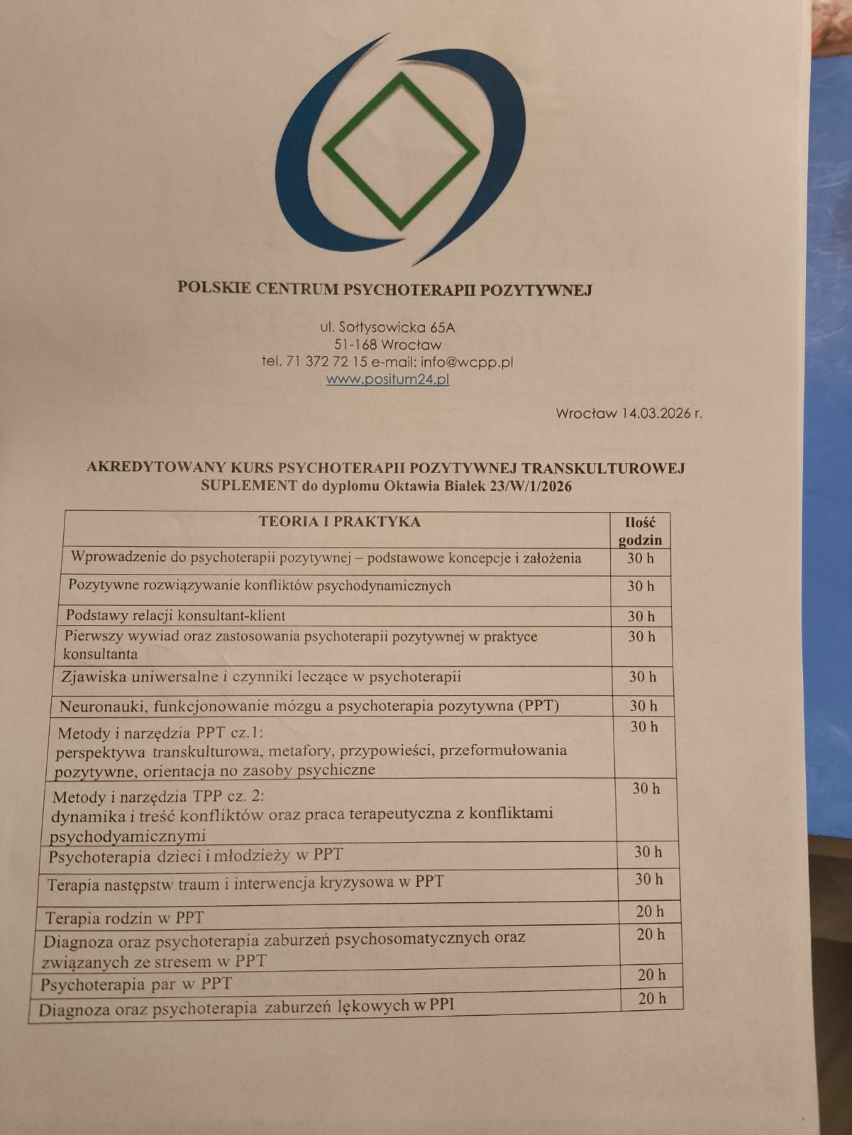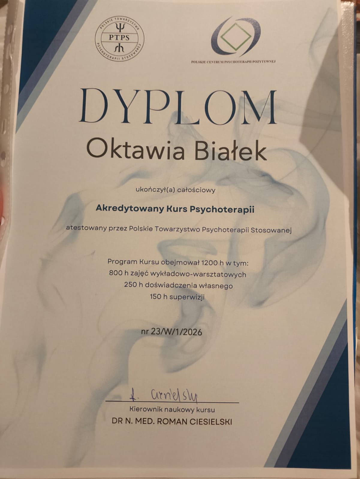 Jestem psycholożką i psychoterapeutką. Ukończyłam kompleksowe szkolenie psychoterapeutyczne w nurcie transkulturowej psychoterapii pozytywnej (PL-043-2024) oraz szkolenie integratywne (psychoterapia pozytywna, ericksonowska, systemowa - nr 23/W/1/2026).